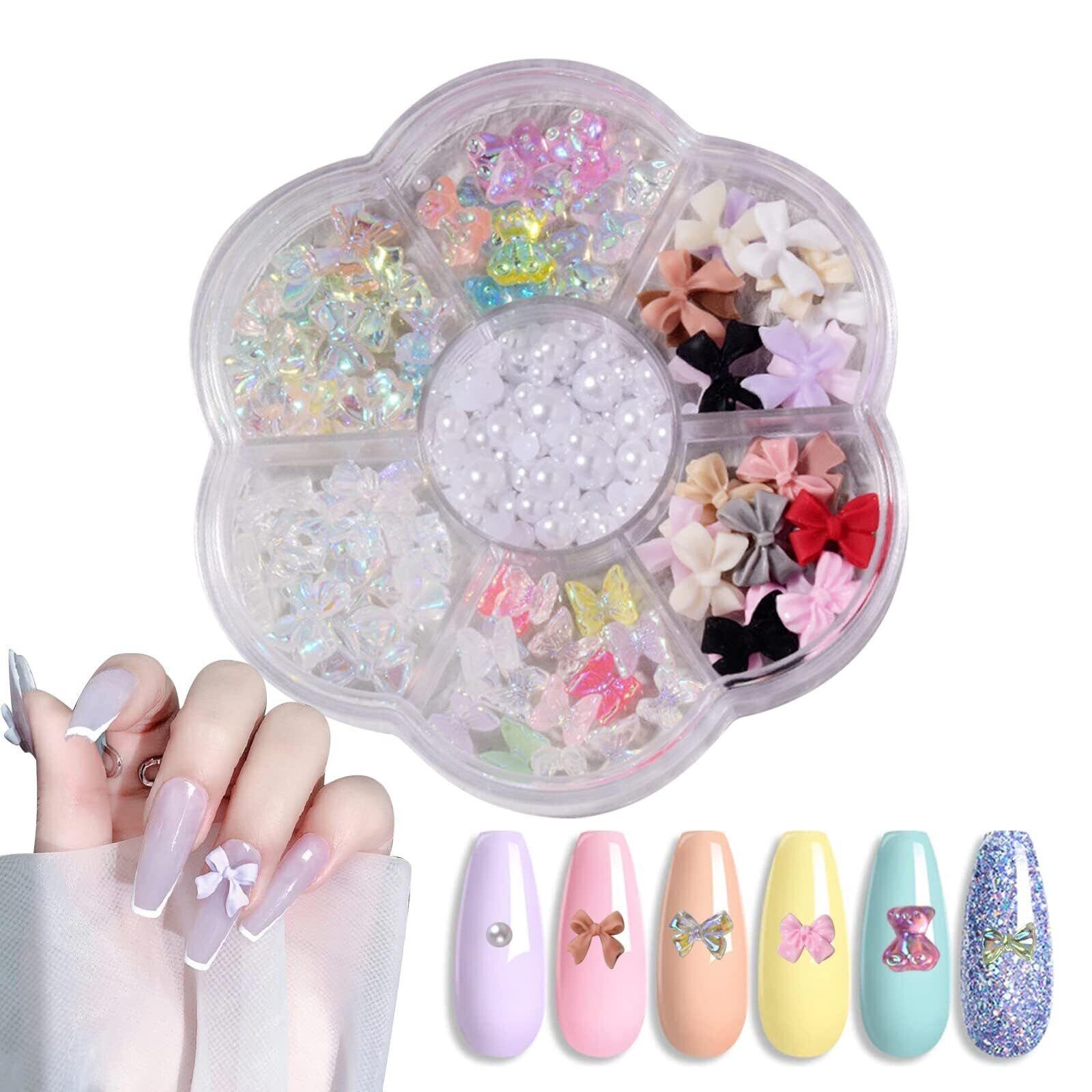 【3Dネイルパーツ】クマ、リボン、蝶々、パールがセットになったネイルパーツです。種類が豊富なネイルパーツは立体感があり、エレガントで上品なネイルを作りたい時に欠かせない。