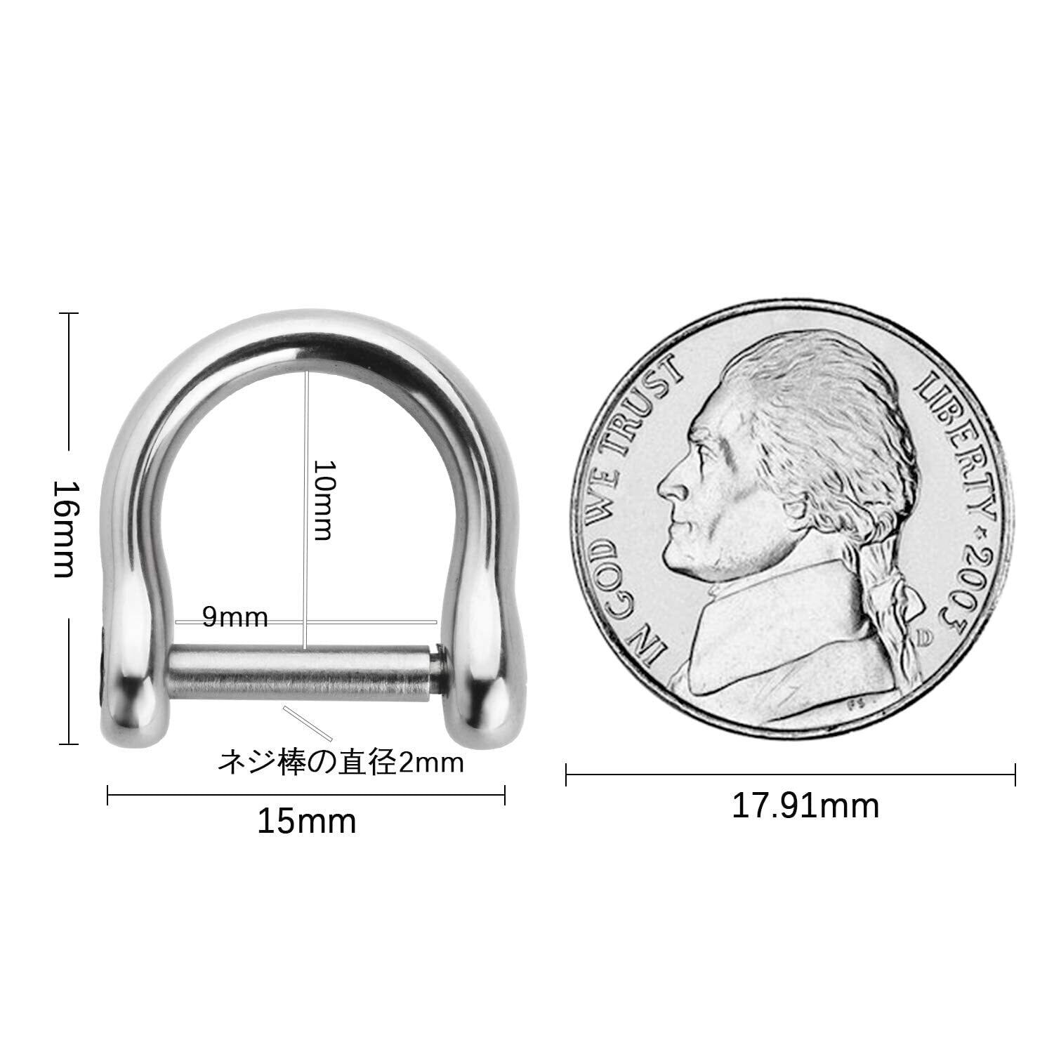 サイズ:外径(縦)16*(横)15mm、 内径(縦)10*9(横)mm、 ネジ棒の直径2mm、 重さ約4g。両端の丸型ベースの直径:5.48mm。