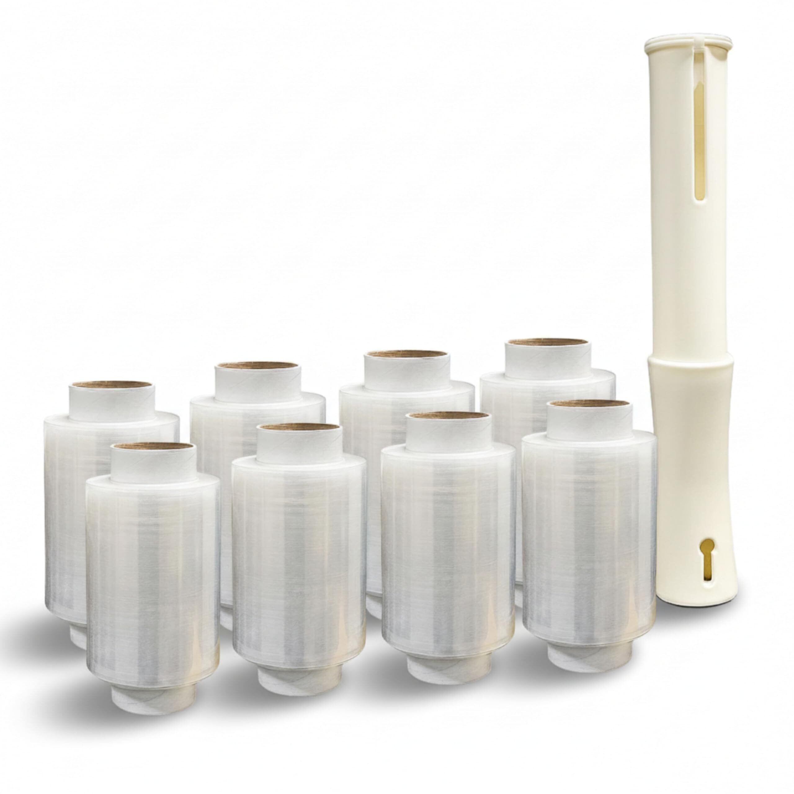【仕様】 フィルム厚:15μ(強化配合により20μ相当の強度) 幅 × 長さ:100mm × 150m 色:透明 材質:LLDPE(メタロセン配合多層フィルム) 巻き方向:左右両対応(ラップを上下反転で切替) ●セット内容(箱売り) ミニストレッチフィルム 8個(各:幅10cm×150m/15μ) 専用ホルダー 1本(再生材配合・リユース設計)