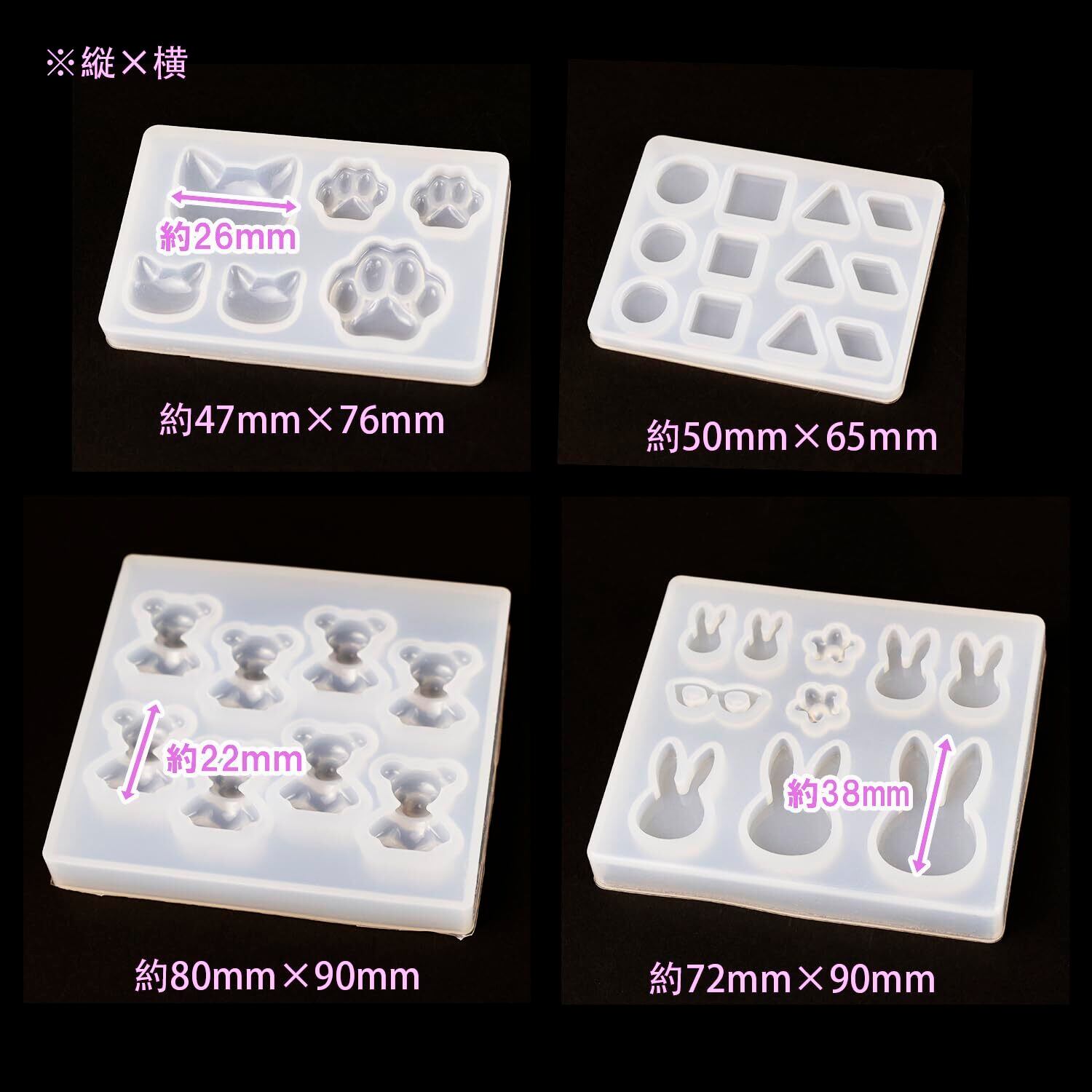 UVレジン、エポキシ樹脂、樹脂粘土などにご利用いただけるシリコンモールドです。うさぎ・ネコ・爪・クマ・幾何・丸型・三角・四角などアクセサリーパーツの4個レジン型セットです。