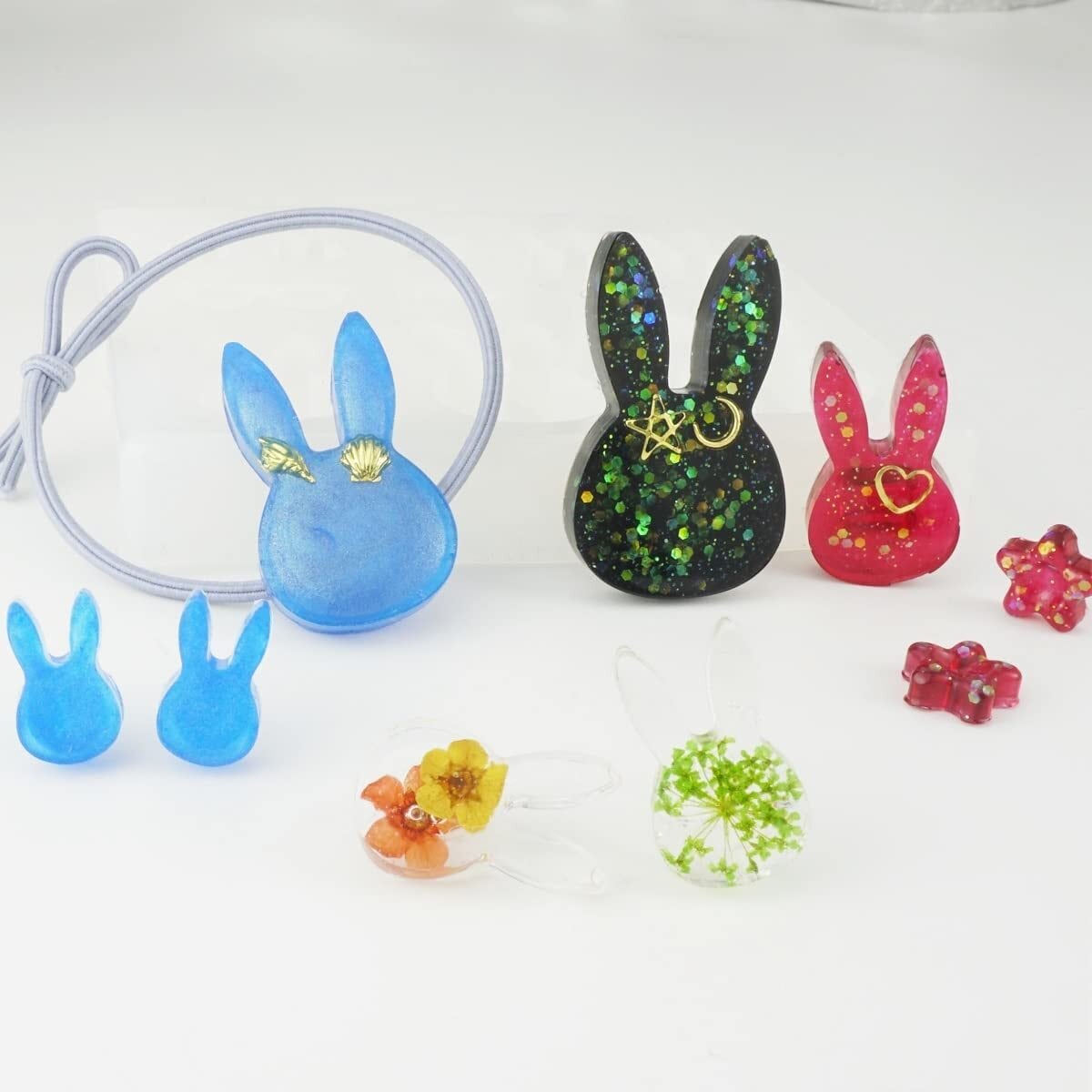 4個のシリコンモールドでパーツを合計9種も作れ、ネックレスのペンダント、ストラップなどのオリジナルの作品を製作することができます。ヘアゴム・ピアスなど様々なアクセサリーのチャームパーツに最適です。