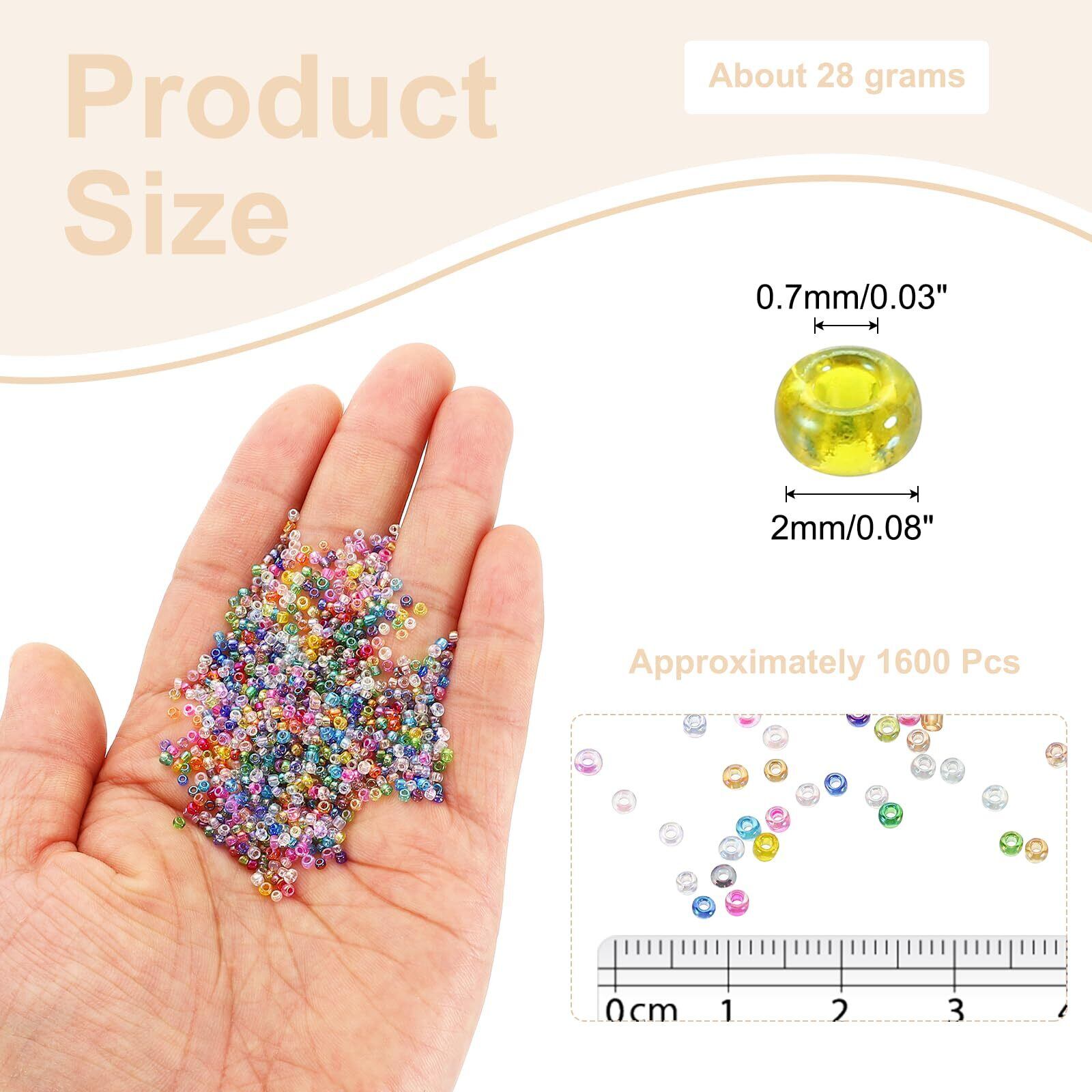 サイズ&パッケージ - パッケージには28グラム(約1600個)のガラスシードビーズが含まれており、直径2mm、11/0のDIY宝石メイキング用です。小さなシードビーズには0.7mmの穴があります。