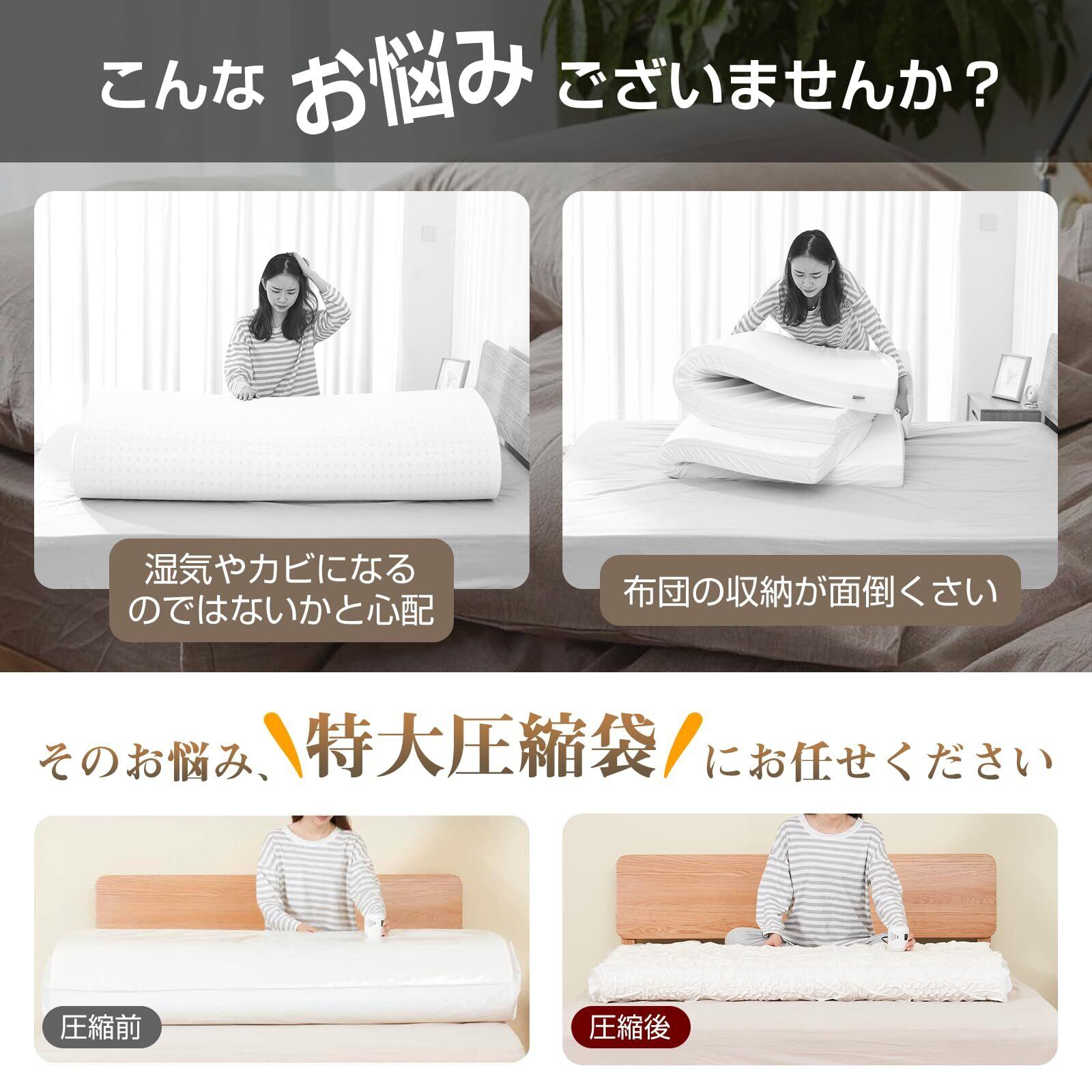 【75%のスペースを節約】 シングル、ダブルサイズのマットレス、ラテックスマットレス、布団、枕や大きめの衣類などを簡単に圧縮できて収納でき、最大75%の収納スペースを省くことができます。立てて収納もでき、狭い収納スペースを有効活用できる圧縮袋です。