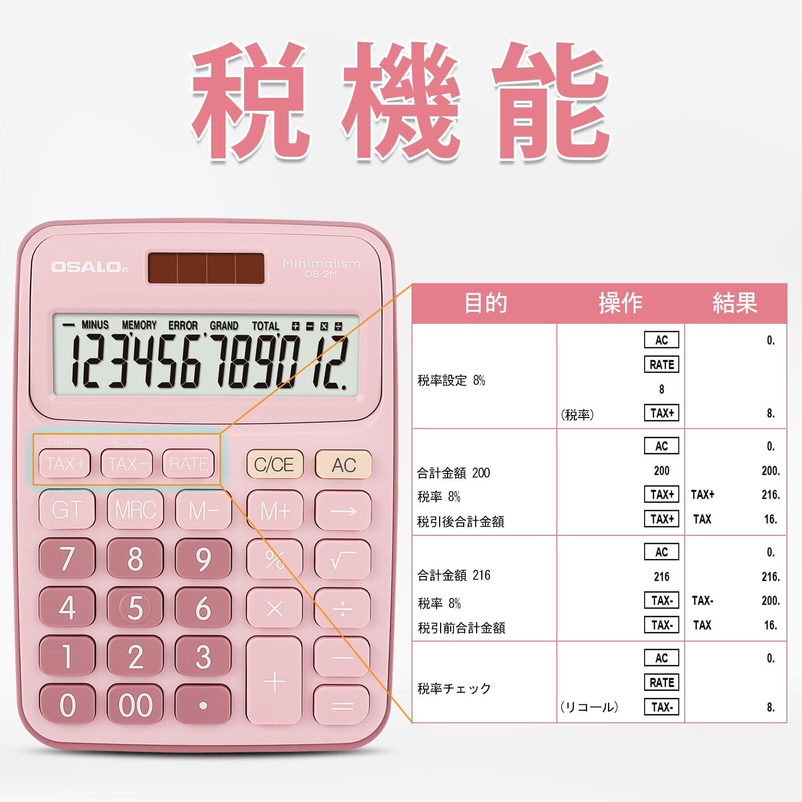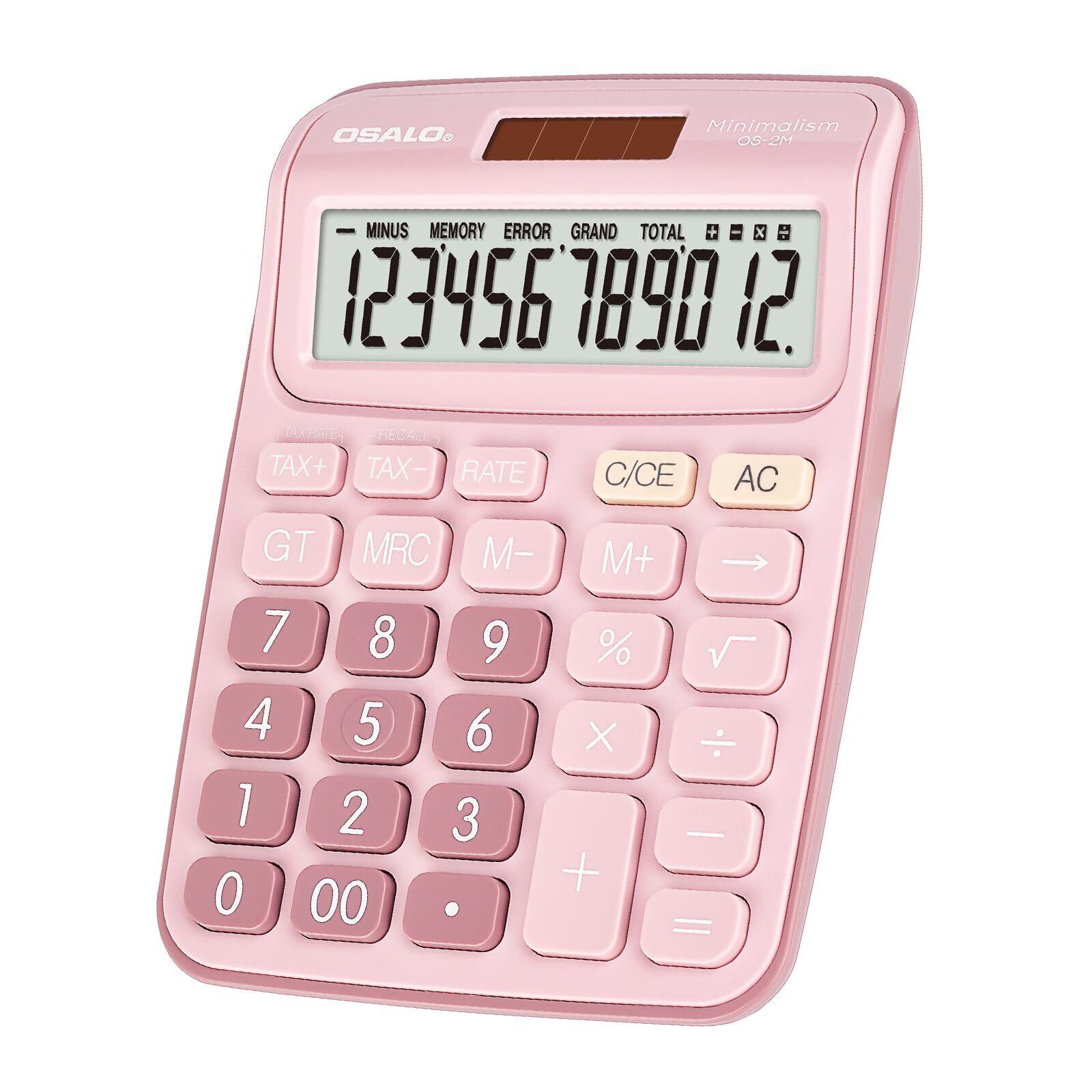 Pendancy 卓上電卓 大型LCDディスプレイ 12桁 数字ビッグボタン 税金会計計算機 電池式 太陽光発電 デスク オフィス 自宅 ビジネス用 (OS-2M ピンク)