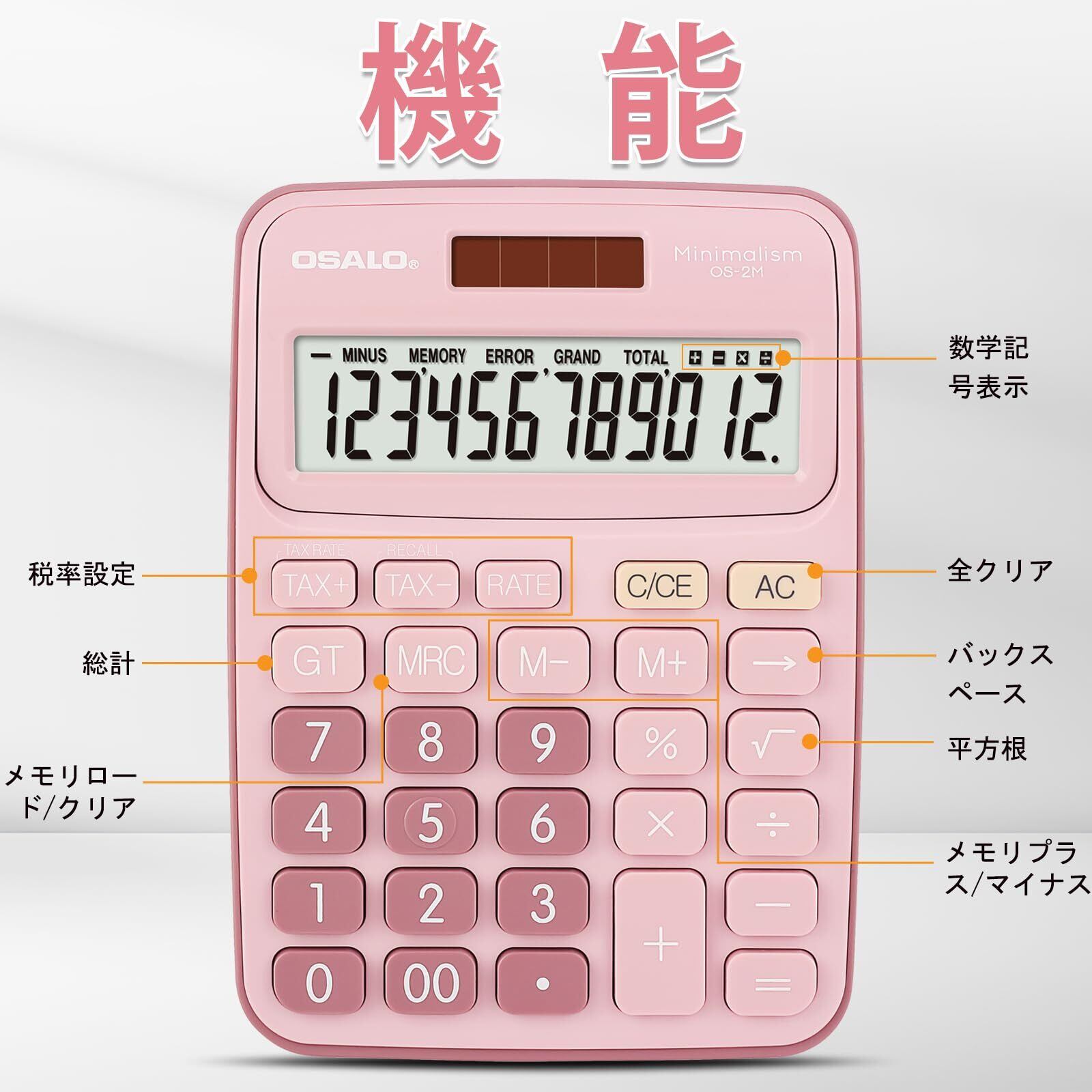 【在庫処分】Pendancy 卓上電卓 大型LCDディスプレイ 12桁 数字ビッグボタン 税金会計計算機 電池式 太陽光発電 デスク オフィス 自宅 ビジネス用 (OS-2M ピンク)