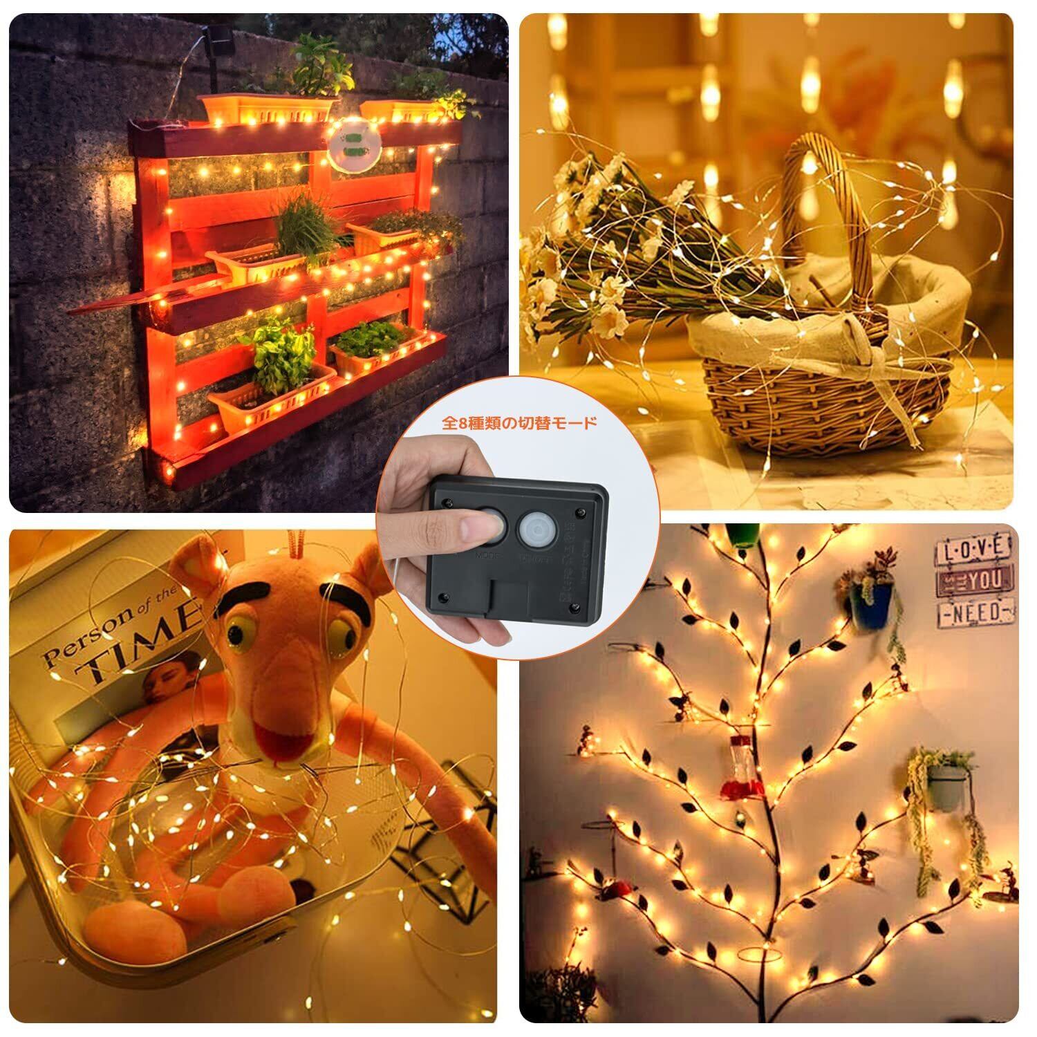【多彩な点灯モード】このイルミネーションライトは8つの点灯モードを搭載。点滅や常時点灯など、シーンに合わせて自由に選べます。夜間には自動で点灯し、手間いらずで美しい空間を演出。特別なひとときをより華やかに彩ります。