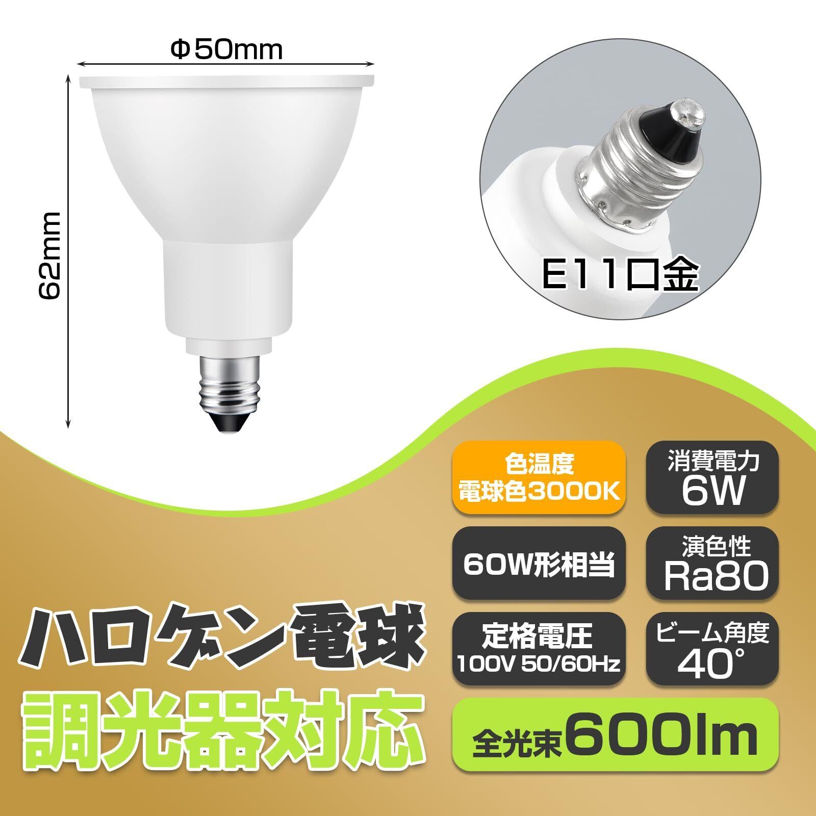 仕様:E11口金、寸法:直径50mmx高さ62mm、消費電力:6W、入力電圧:AC100V 50/60HZ。 全光束:600lm | 色温度:電球色3000K | 演色性:Ra80+ | ビーム角度:40°