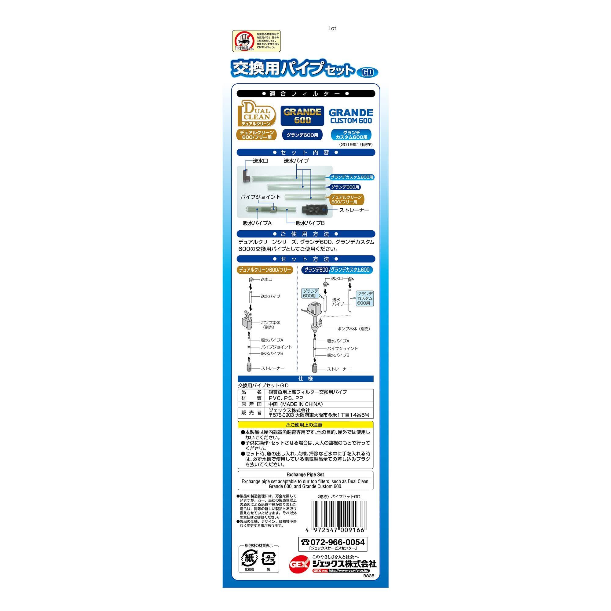 デュアルクリーンシリーズ、グランデ600、グランデカスタム600の交換用パイプとしてご使用ください。 ・セット時は、魚の出し入れ、点検、掃除など水中に手を入れる時は、必ず水槽で使用している電気製品全ての差し込みプラグを抜いてください。