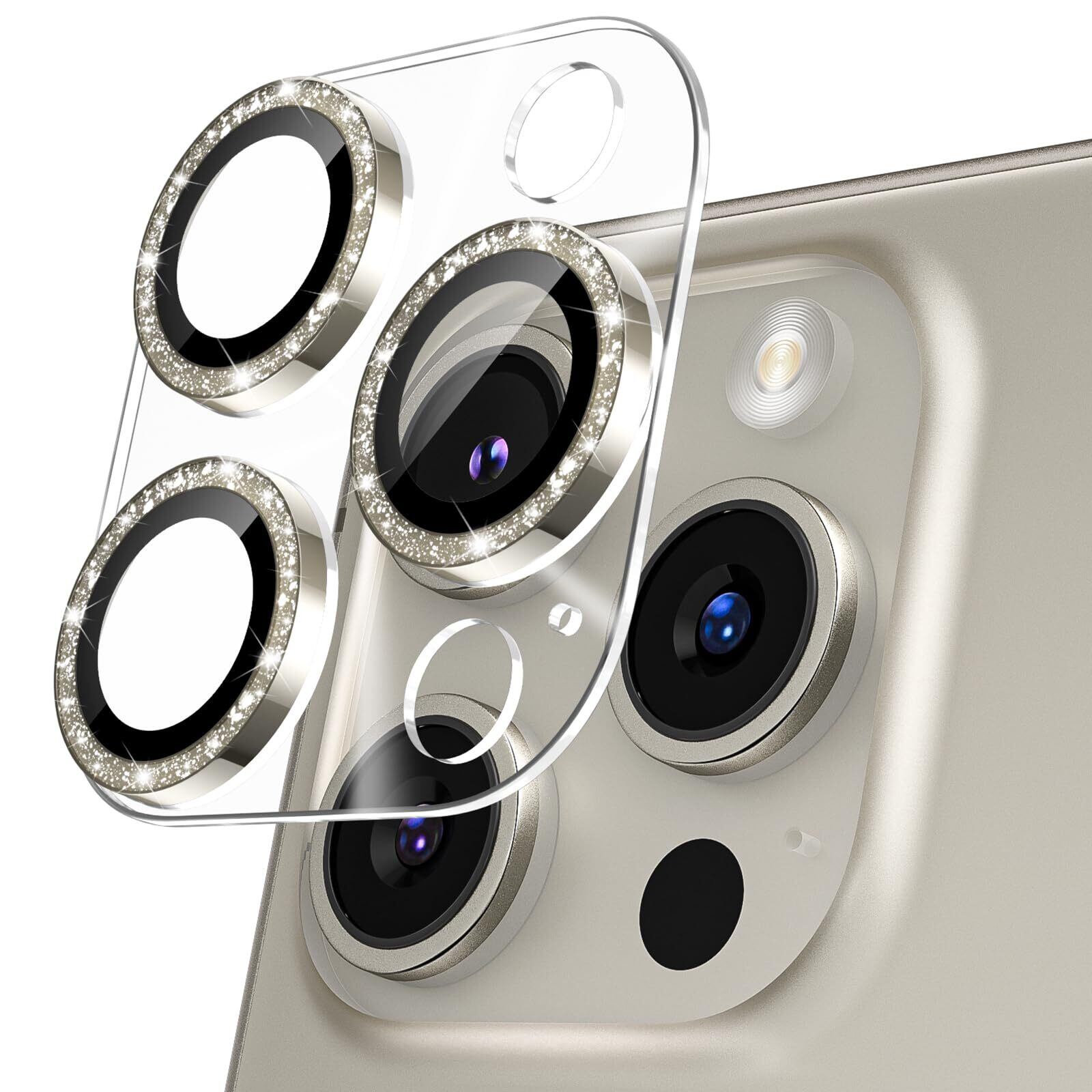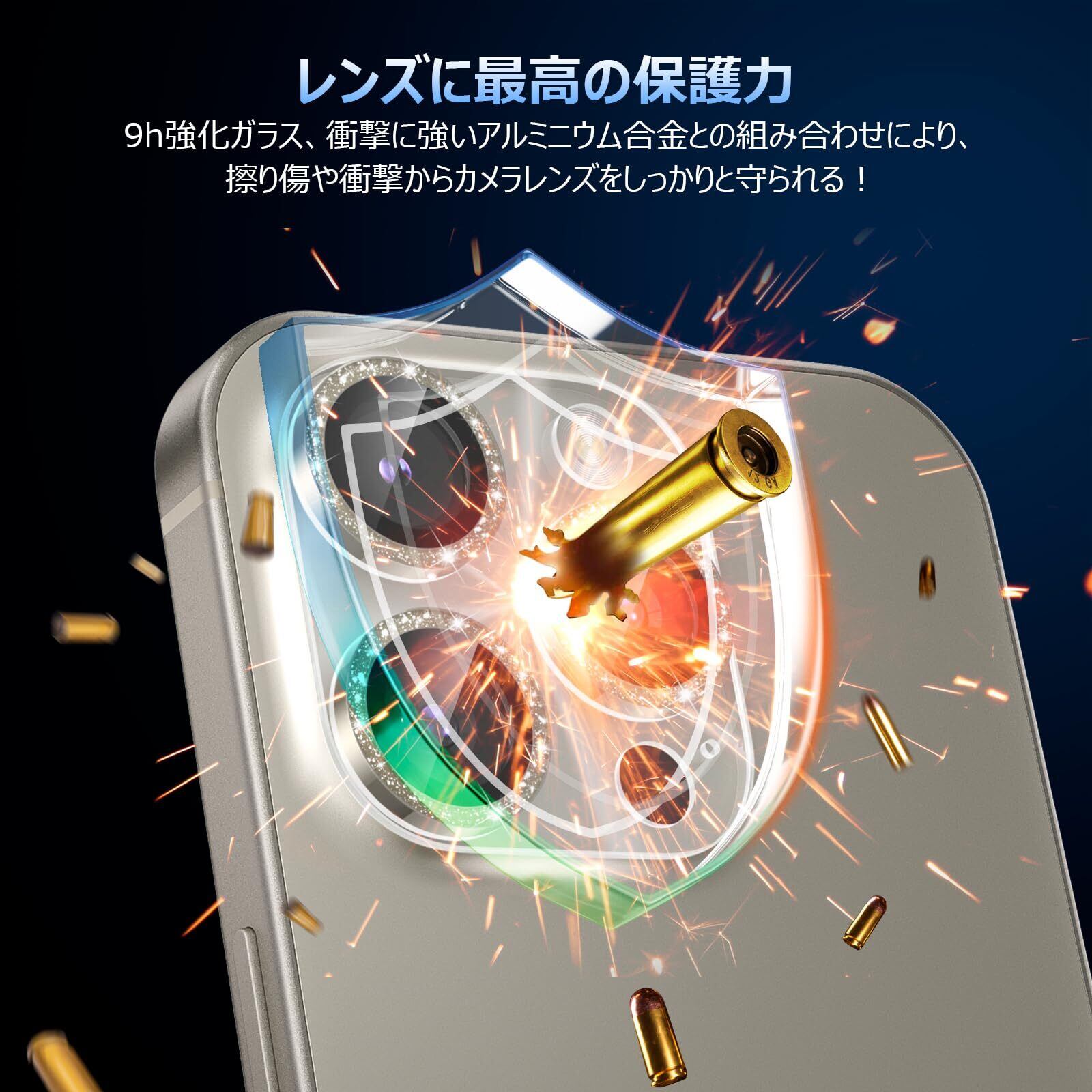 カメラフィルム iPhone 15 Pro/15 Pro Max用 カメラカバー キラキラ 9H強化ガラス アルミ合金 アイフォン15プロ/15Pro Max用 カメラ保護 ピカピカ キズ防止 耐衝撃 高透過率 黒縁取り 露出オーバー防止 極薄 レンズカバー プロテクター ナチュラルチタニウム