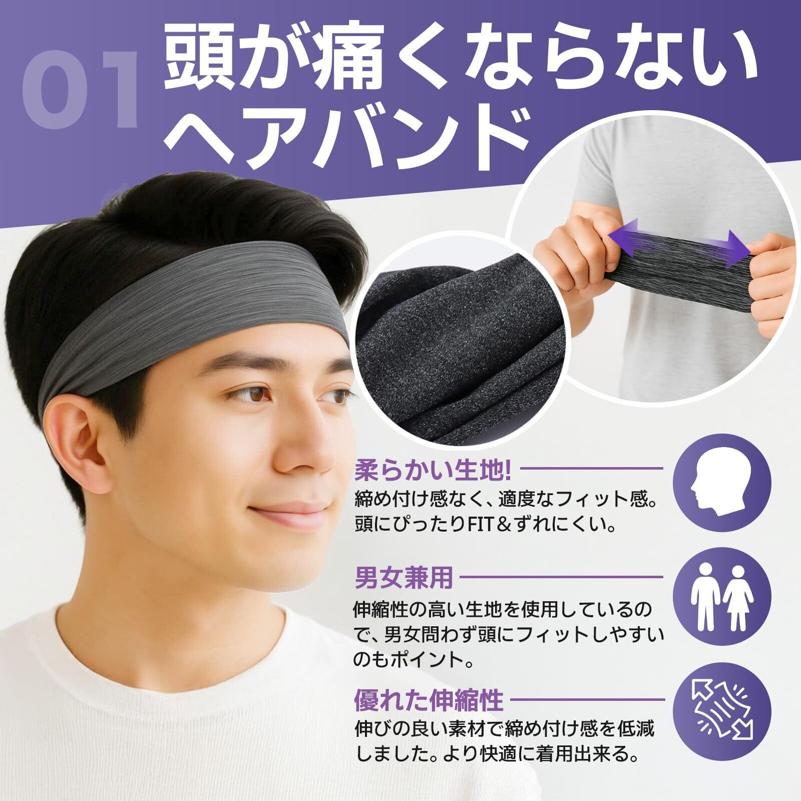 「伸縮性」適度な伸縮性なので、ダンスやランニングなど激しい運動でもズレたりせず、ピッタリとフィット!重さも感じないため付け心地も良く、あらゆるスポーツに最適なヘアバンドです。