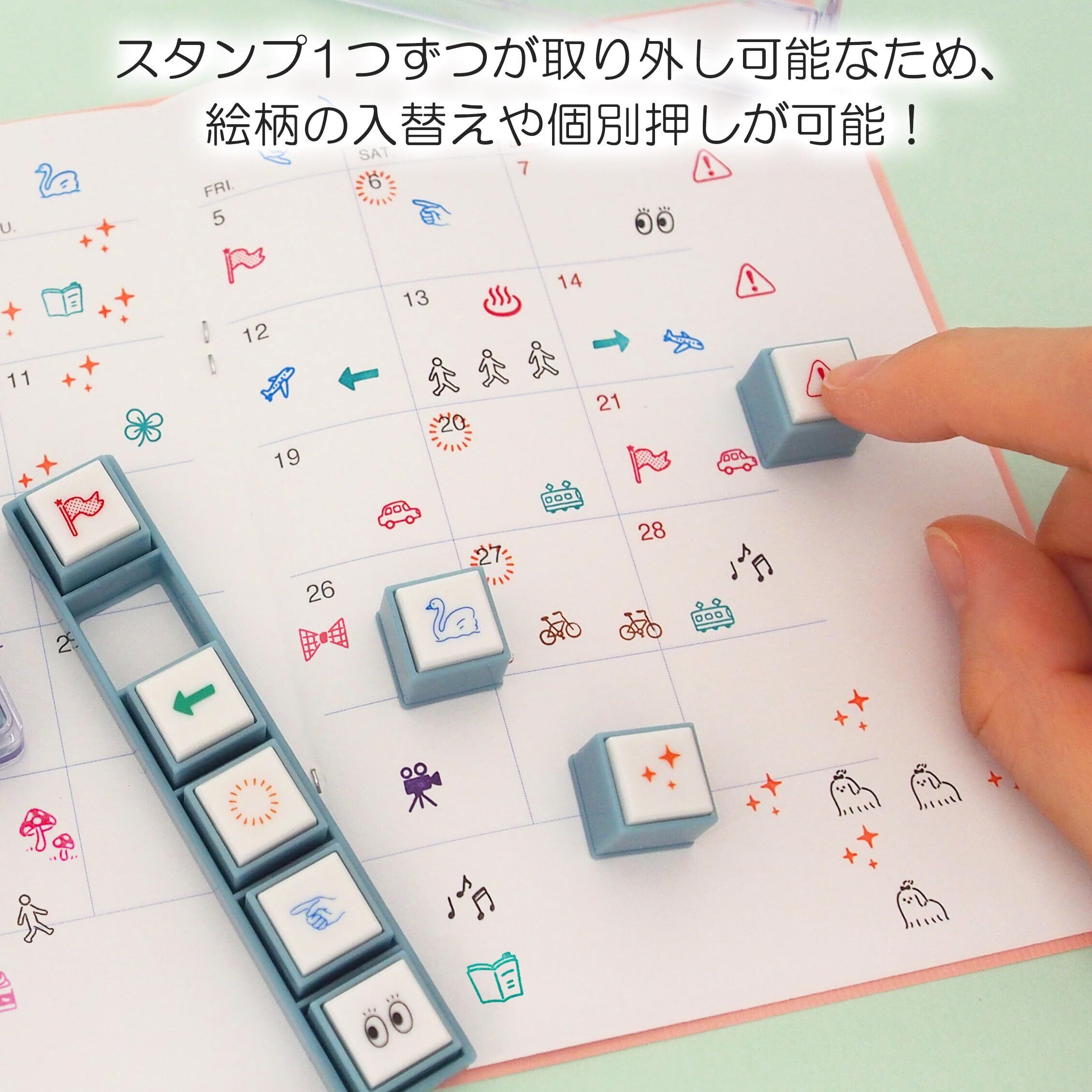 ポチッとシックスの進化版スタンプ「ポチッとPick!」はボタンを取り外すことができるようになりました。 6個のボタン型スタンプが枠にカチッとはめてあり、スタンプがはずれてバラバラにならないように、透明のケースに入っています。 透明ケースから本体を取り出して、紙の上にのせイラスト部分を指で上から押すとスタンプできます。スタンプ1個ずつ取り外し可能なので、枠から外して押したり位置や向きを変えて枠にもどすこともできます。