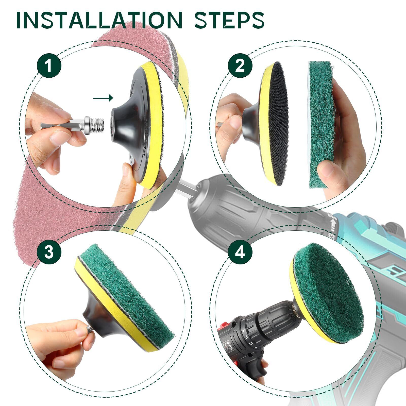 ② 【お手軽な電動ドリル対応】すべてのパッドは電動ドリルに適合し、簡単に取り付けられます。面倒な作業も短時間で完了できるため、掃除や研磨にかかる手間を大幅に削減。忙しい日常の中でも、効率的なクリーニングが可能です。