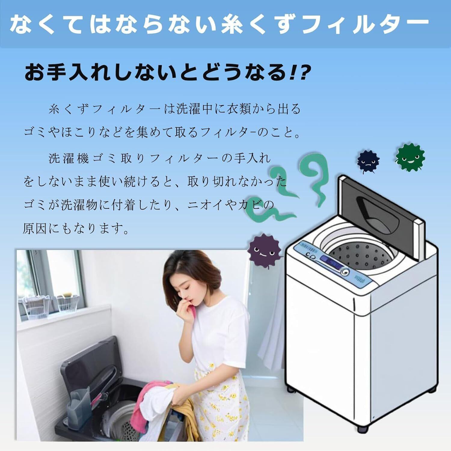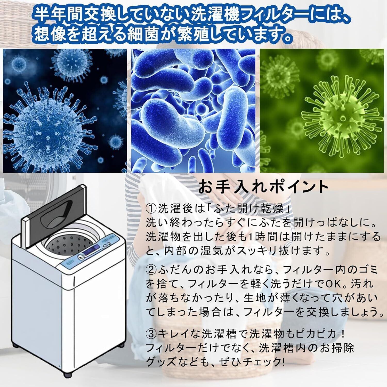 ② 【手軽に取り付け可能】このフィルターは、簡単に取り付けられるデザインで、手間いらずで使い始めることができます。洗濯機の使用中に発生する糸くずやごみを効率よく取り除くことができ、安心して洗濯を楽しむことができます!