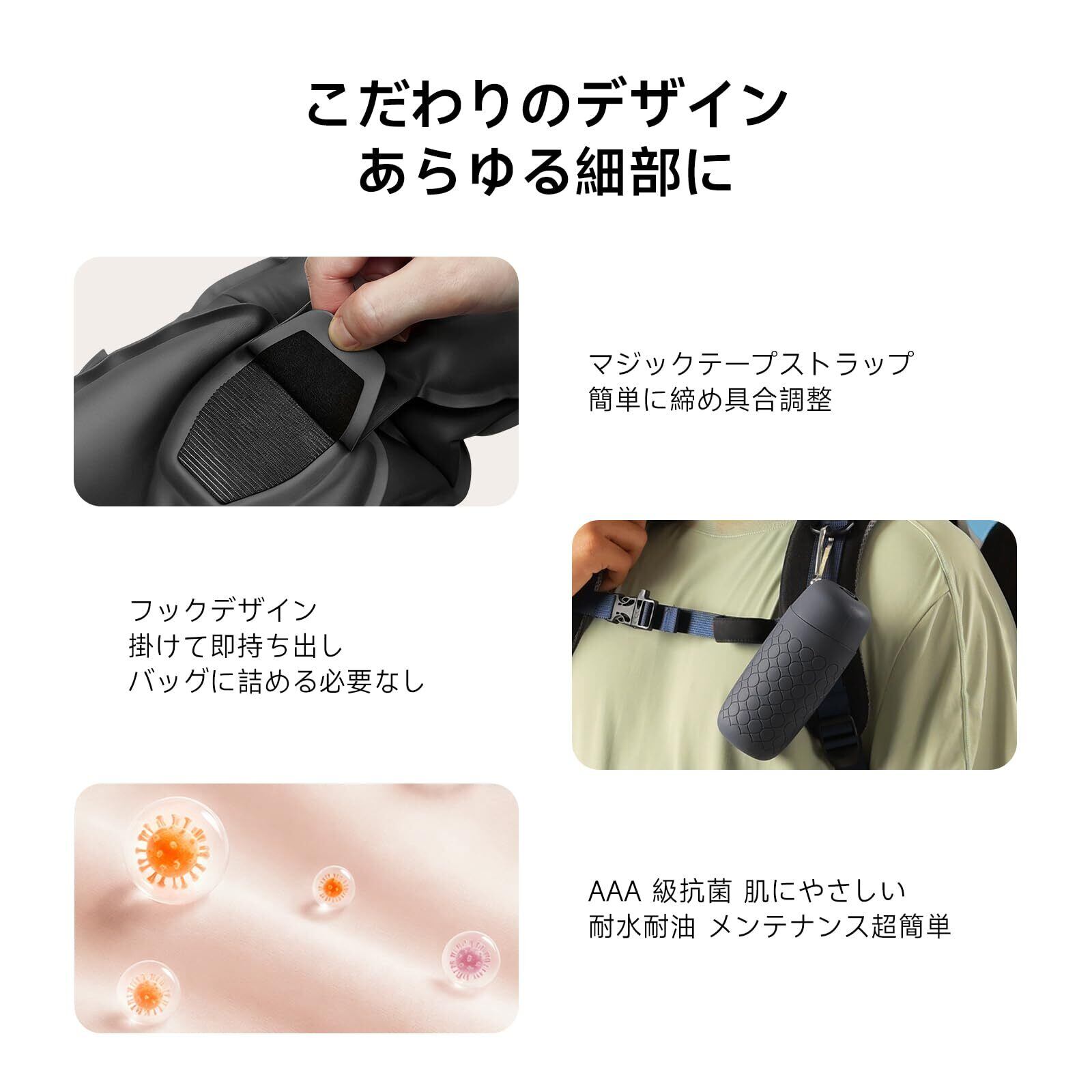 【超軽量・コンパクト設計】 ミニマリズムに基づいた折りたたみ技術を採用し、収納時はスマートフォンと同等のサイズまで小さくなります。カバンやコートのポケットに手軽に収納可能。重さはわずか約100gで、長時間の飛行機移動やオフィスでの仮眠でも荷物の負担になりません。