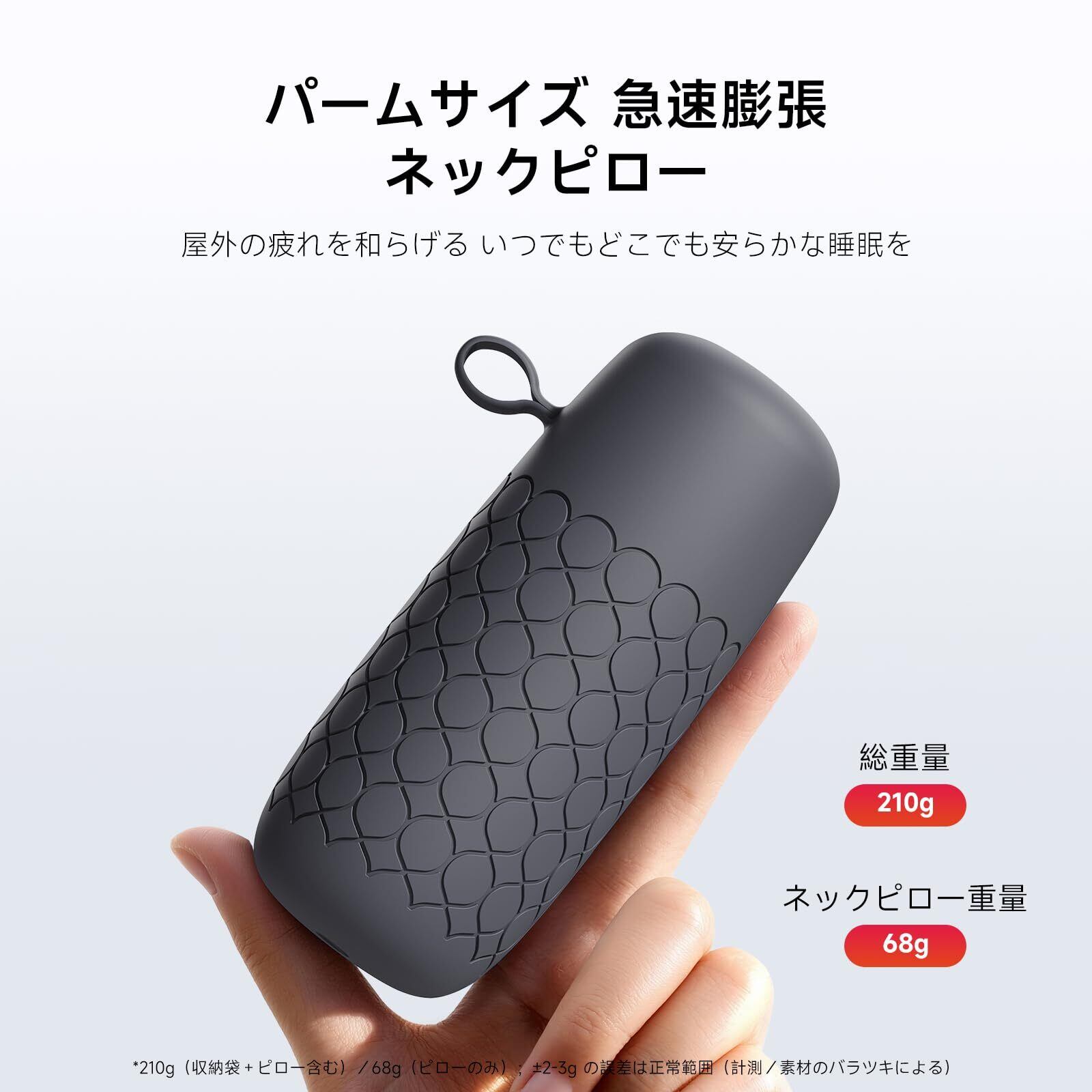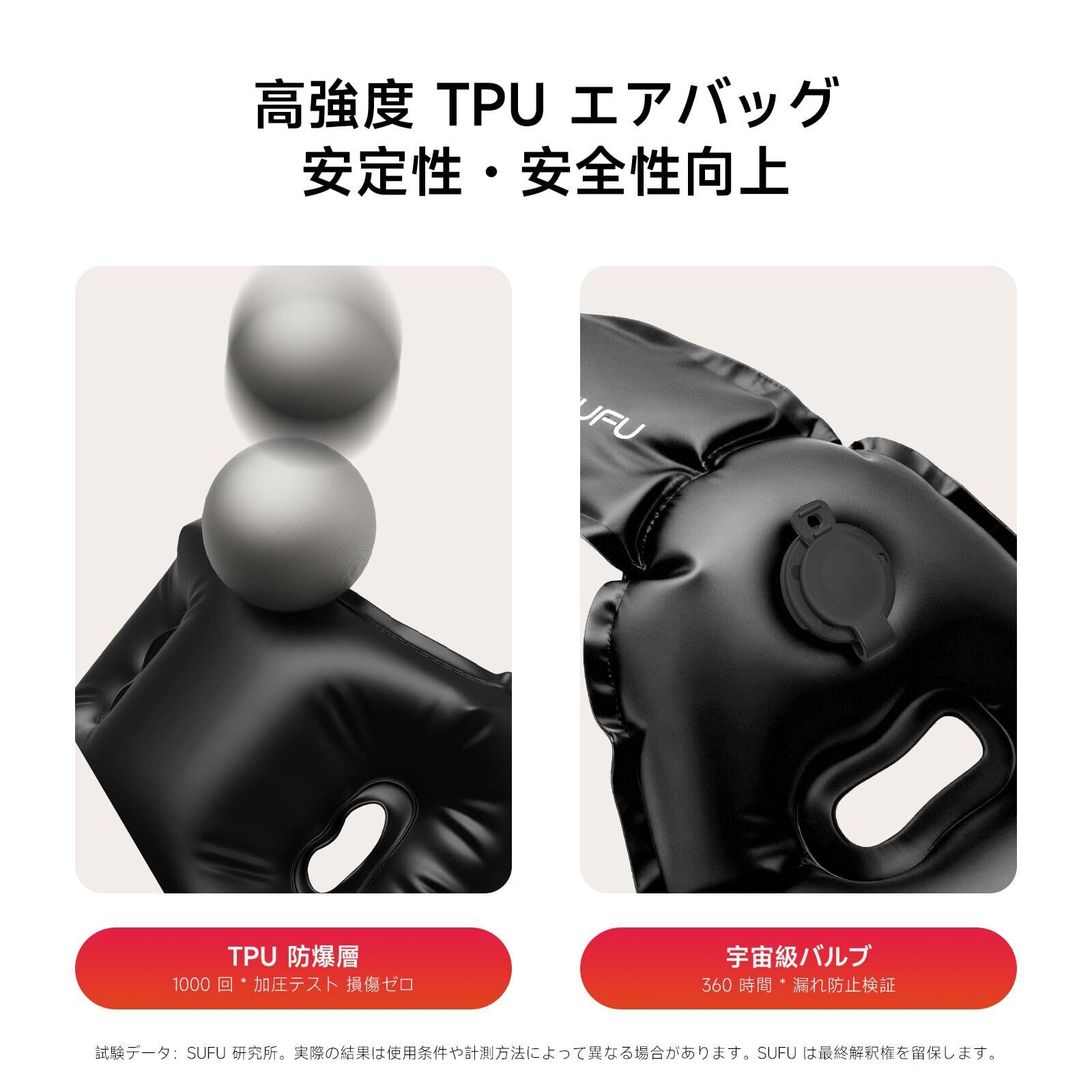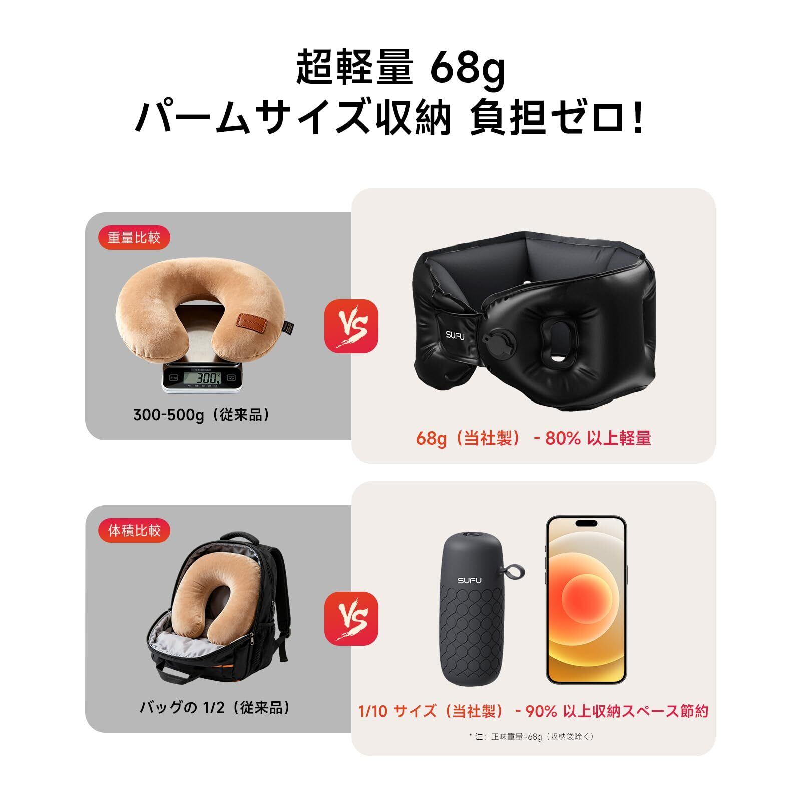 ① 【快適な旅を実現するエアーピロー!】軽量かつコンパクトなSUFUネックピローは、たった68gの重さで持ち運びも楽々。膨らむのもわずか10秒なので、急な旅行でもすぐに使えます!