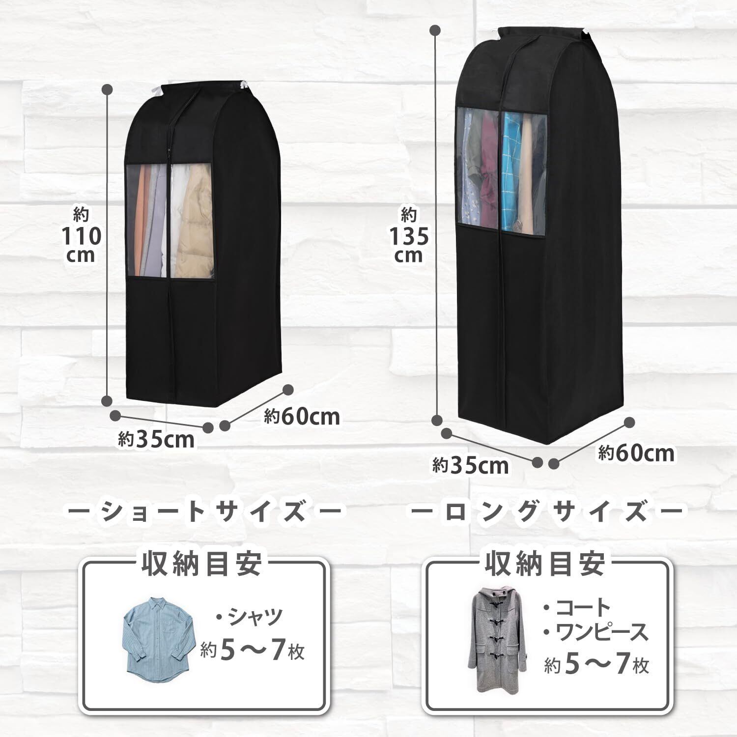 【商品仕様】:ショートサイズ/約(マチ)幅35×奥行60×長さ110cm、ロングサイズ/約(マチ)幅35×奥行60×長さ135cm、カラー/ブラック、内容/3枚(ショートサイズ2枚・ロングサイズ1枚)、収納目安(1枚あたり)/衣類約5~7枚、材質/ポリプロピレン・ポリエチレン