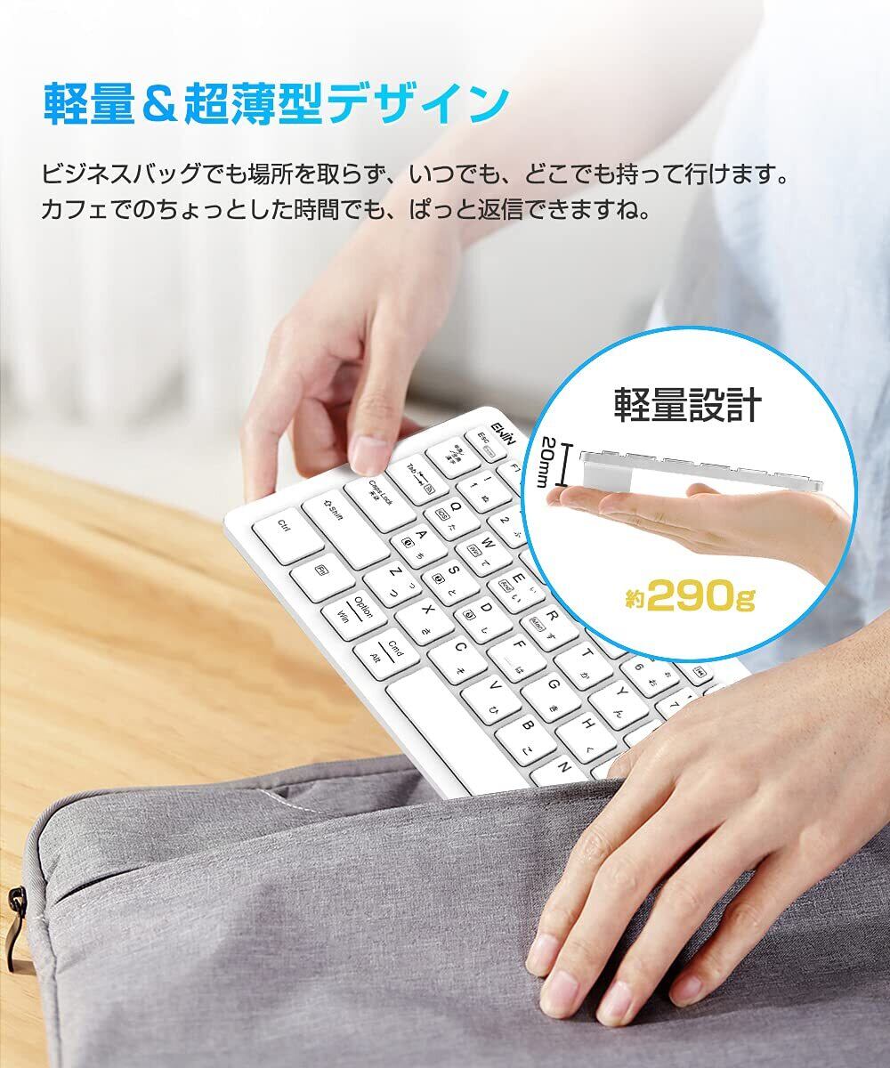 ③ 【快適なタイピング体験!】超薄型デザインのキーボードは、打鍵感が良く、長時間の使用でも疲れにくい設計になっています。また、静音性にも優れているため、静かな環境でも安心して使用できます。