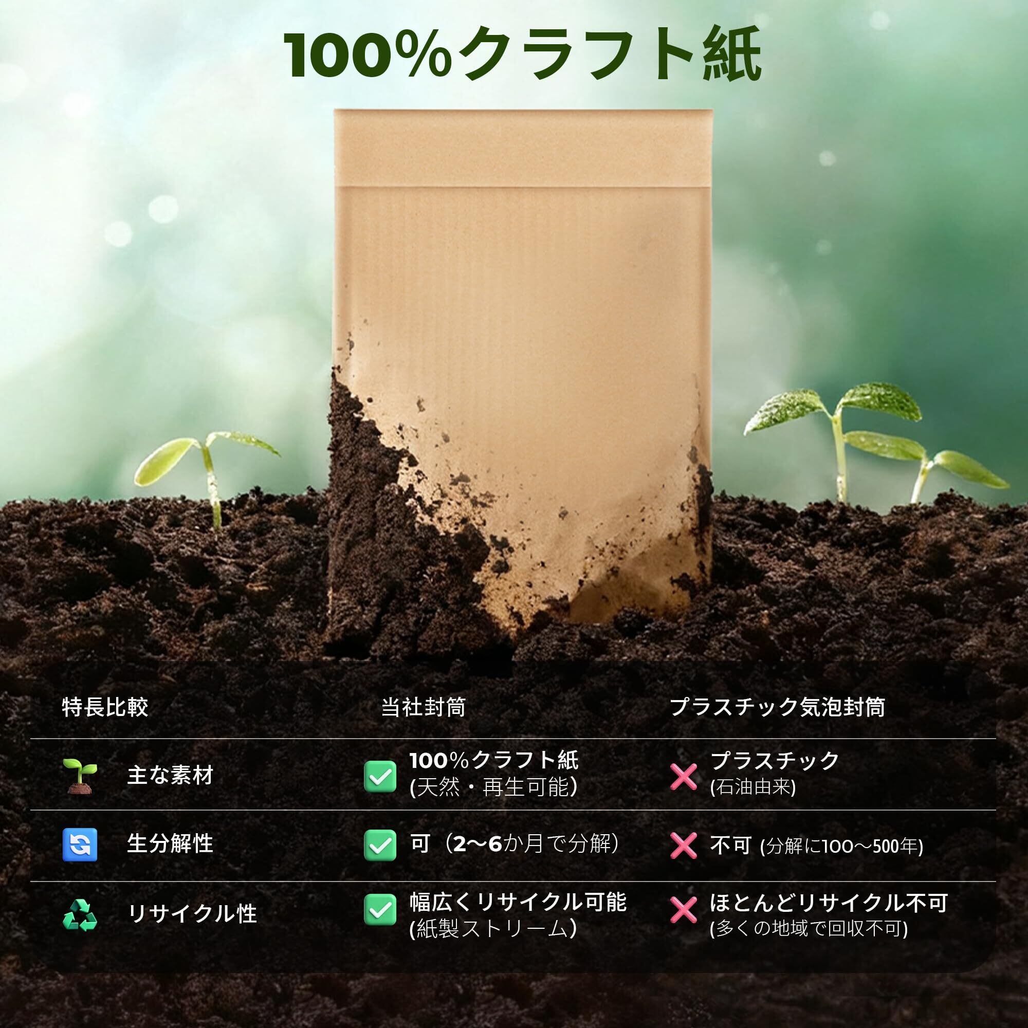 【業界トップレベルの80gsm厚紙】 重量感のある80gsmクラフト紙(市場標準品より30%厚い)を使用しており、耐久性と耐裂性に優れています。この高密度素材により、商品をしっかり保護しつつ、完全に生分解可能で、強度と環境配慮の両立が可能です。