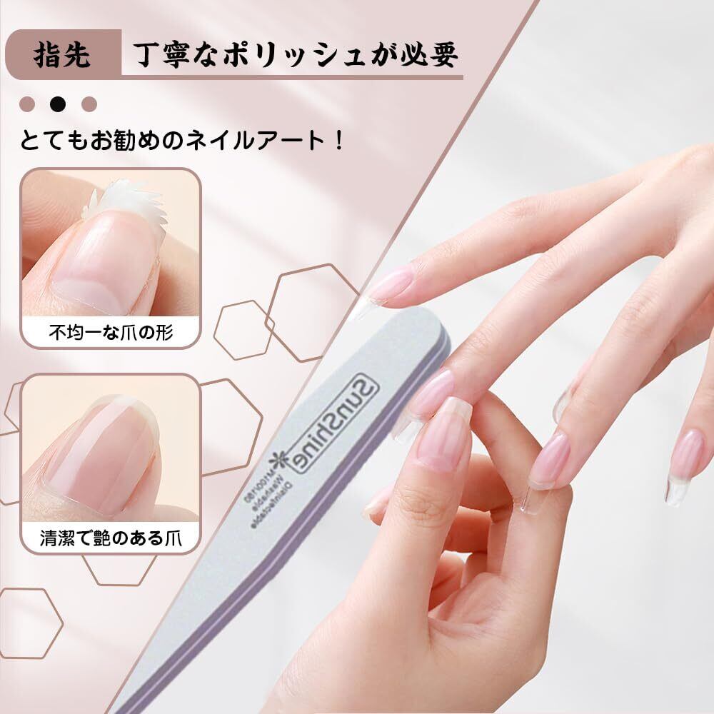 100グリットで爪のデコボコした表面を磨き、残ったネイルグルーを取り除きます。180グリットで爪表面の油分を取り除き、エッジを滑らかにし、より繊細な形に仕上げます。