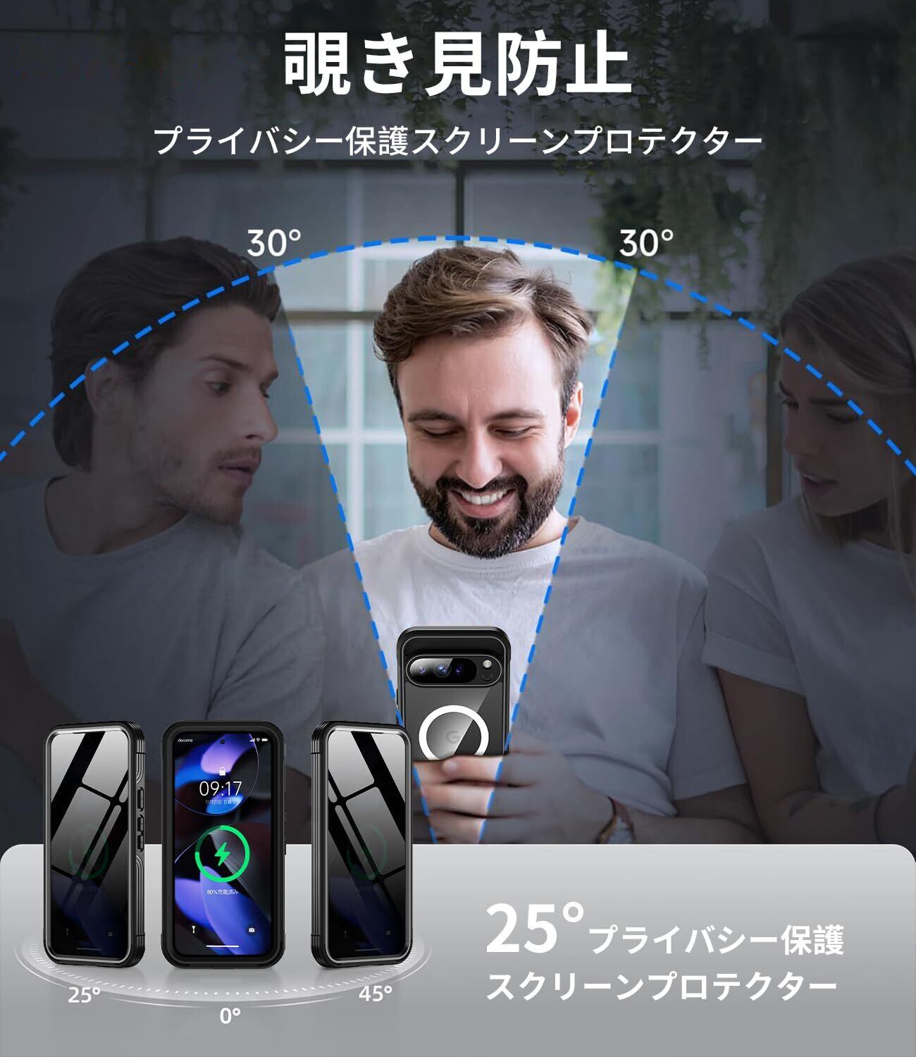 [覗き見防止・9H高精細耐傷スクリーン]NIANGUO Google Pixel 9 Pro XLケースは内蔵プライバシースクリーンにより、90°の角度で透光率は99.99%に達します。側面はしっかりと遮光され、画面が暗くなり、覗き見や情報漏洩を防ぎます。どこへ行くにもスマホ画面と個人情報を保護。同時に画面のキズ防止も実現。このPixel 9Pro XLフルボディケースは、強化ガラスフィルムを追加する必要がなく、気泡やズレなどの問題を心配する必要もない。高精細な強化ガラスのフロントカバーは、スクリーンを傷から守るだけでなく、タッチ操作に素早く反応し、耐油性、耐水性に優れ、手触りも快適です。
