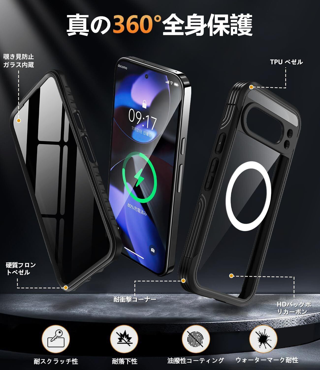[パチッと両面装着、簡単!・360°全身保護]このGoogle Pixel 9 Pro XLカバーは、柔らかいTPUフレームを採用しており、適度な弾力性で取り外しが非常に簡単です。このGoogle Pixel 9 Pro XL用ケースは二重ガラスと複合素材設計を採用し、前面・背面カバーが360°全方位の堅牢な保護を提供します、最小限の取り付けで済むように作られています。 四隅のエアバッグ式衝撃吸収構造と4層TPUソフトバンパーが完璧に融合し、、衝撃を最大限に分散。高低差のデザインで、日常生活でカメラや画面への擦り傷を防ぎます。Pixel 9 Pro XLを全方位からしっかりと守ります。衝撃を最大限に分散します。注意:画面保護フィルムを貼ってる必要はありません、操作反応が低下します。