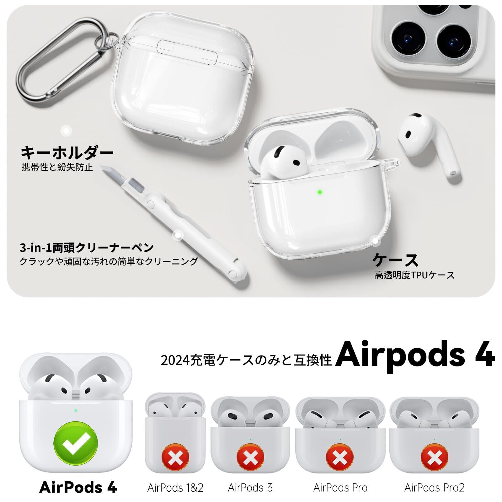 Inesore for AirPods4 ケース クリア (2024) カラビナ & クリーニングペン付き、TPU素材/全面保護/耐衝撃/強力な落下防止、エアーポッズ 第4世代対応保護カバー-ホワイト