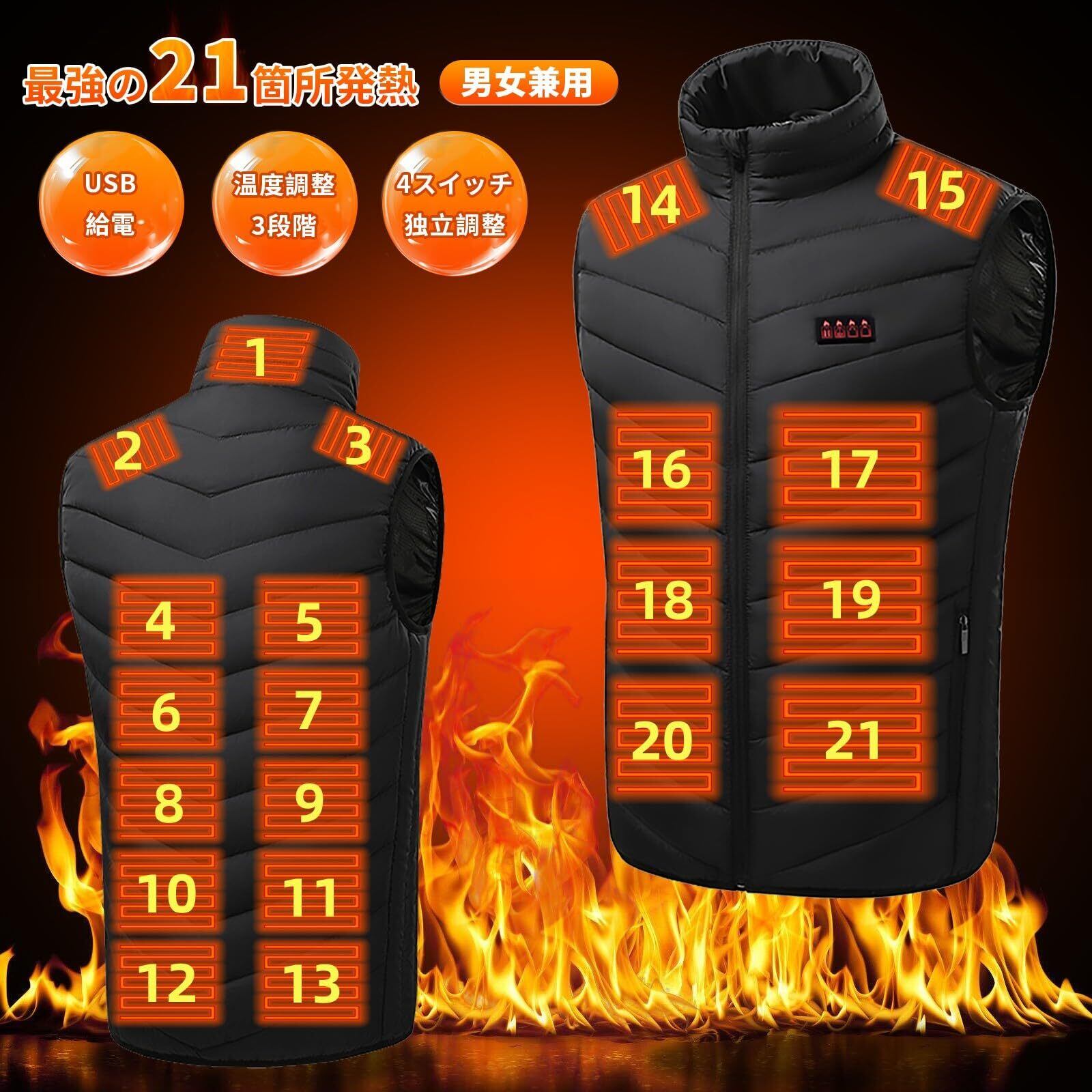 [BOEN] 業界初の21箇所発熱 電熱ベスト USB給電 4つ独立制御ボタン 3段階温度調整 速暖 防寒着 軽量 丸洗い 通勤 通学 キャンプ バイク ゴルフ スキー 屋外作業 メンズ レディース 男女兼用