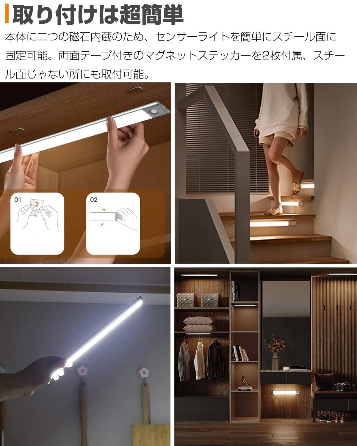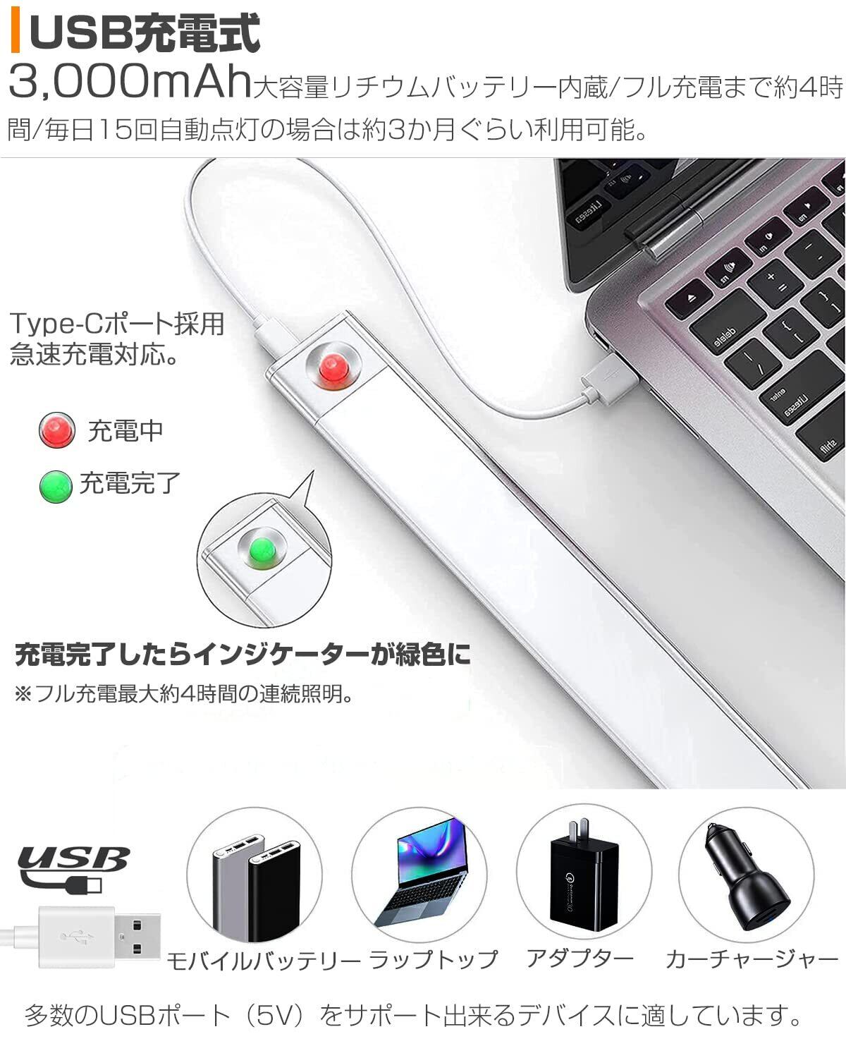 【2本入り】 人感センサーライト 60cm 電球色 室内 LED バー ライト 充電式 3000mAh キャビネットライト 超薄型設計 手元灯 マグネット LEDライト 配線工事不要 省エネ 長寿命 高感度 高輝度 部屋 玄関 廊下 キッチン 棚