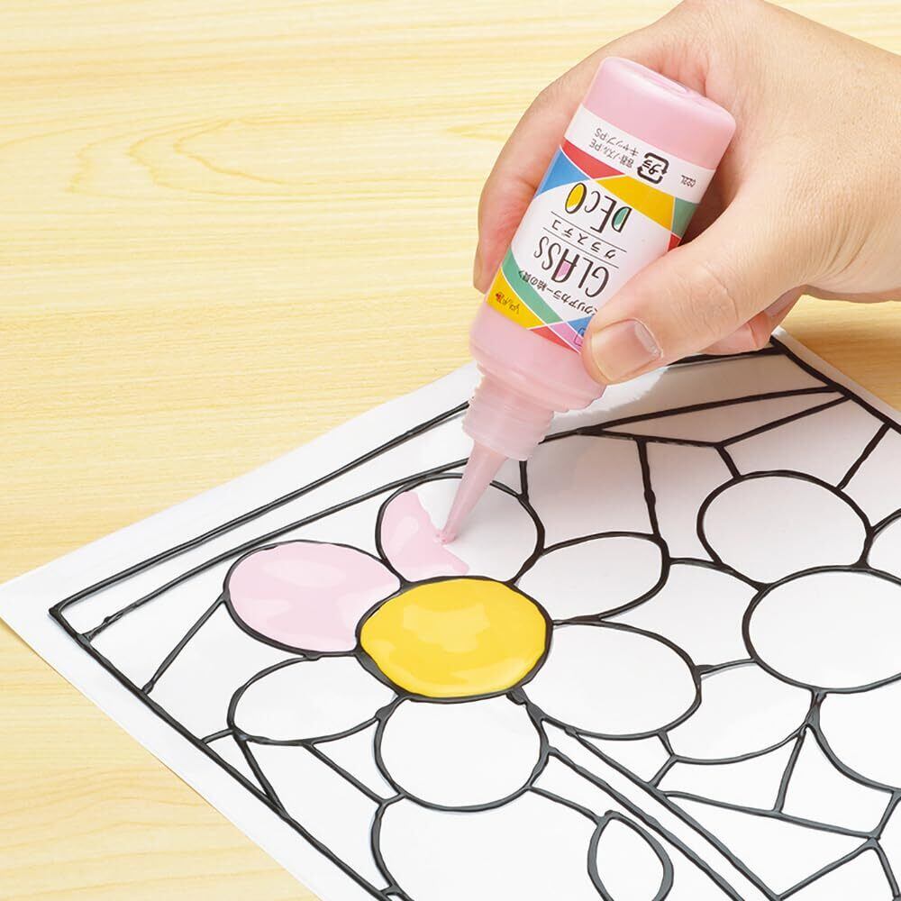 グラスデコは、のりと絵の具が合体した、乾くとステンドグラスに似たカラフルで透明感のあるシールになるクリアカラー絵の具です。