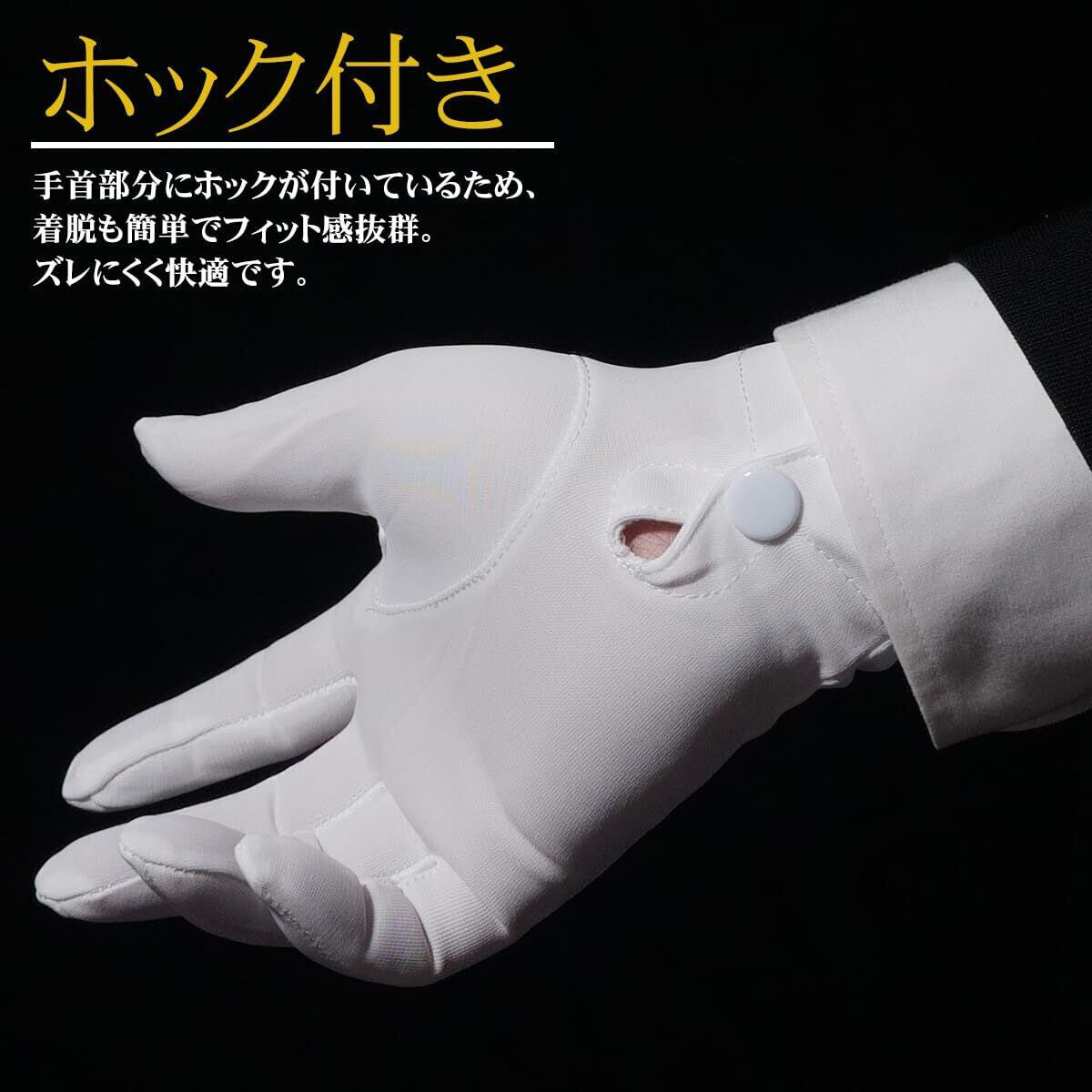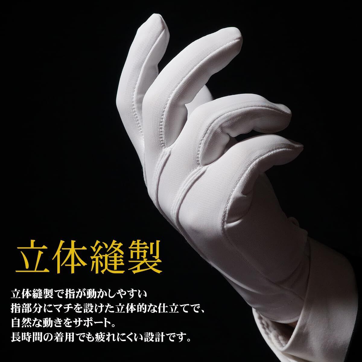 【指先マチ付きの立体縫製】指が動かしやすい設計で、接客・運転・式典などの動作もスムーズ。快適なフィット感を実現しました。【幅広い用途とサイズ展開】S〜LLの4サイズ展開。結婚式・葬儀・式典・接客業・選挙事務所・応援団など、あらゆる礼装シーンに対応します。