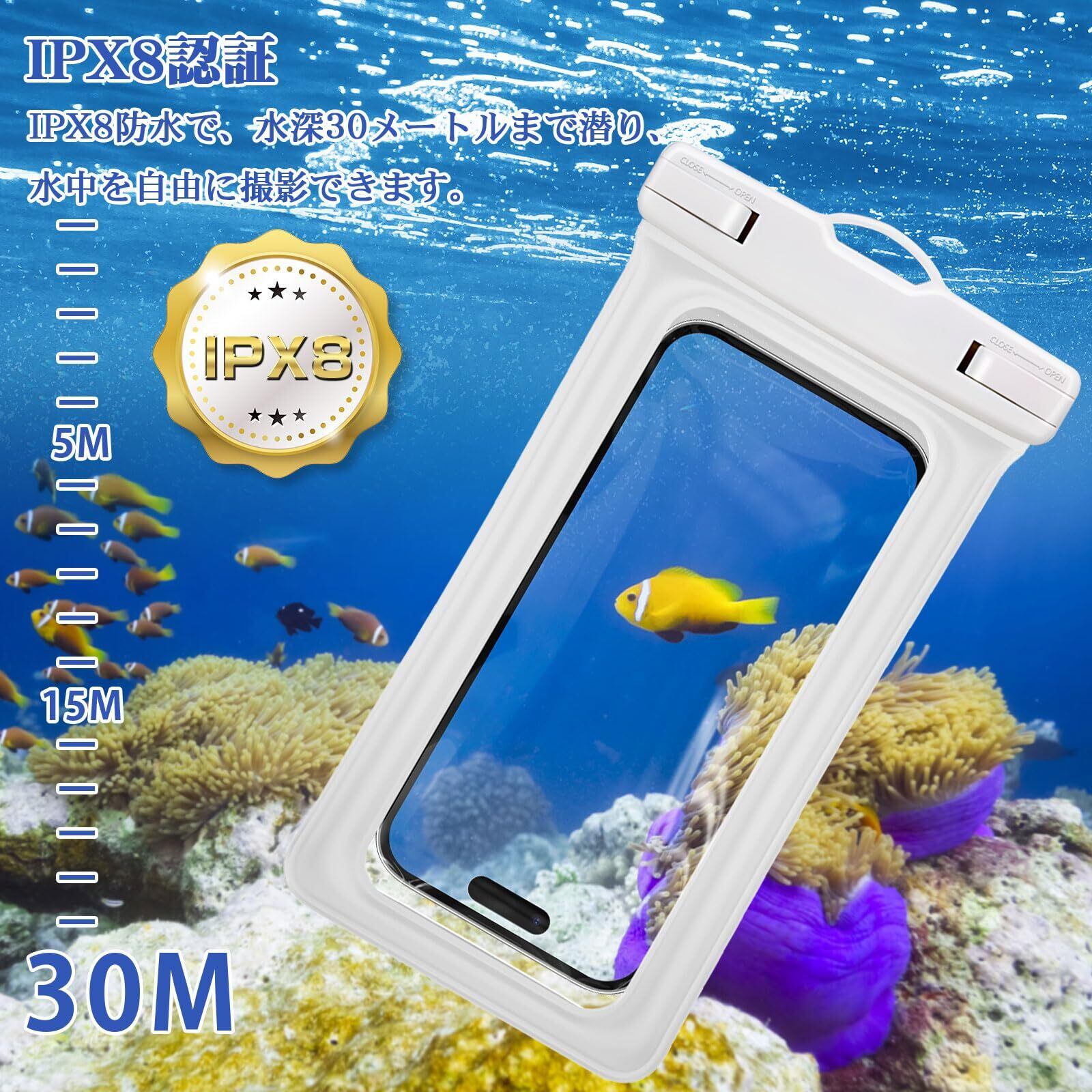 【IPX8認証】 スマホ 防水ケースはIPX8防水で、水深30メートルまで潜り、水中を自由に撮影できます。