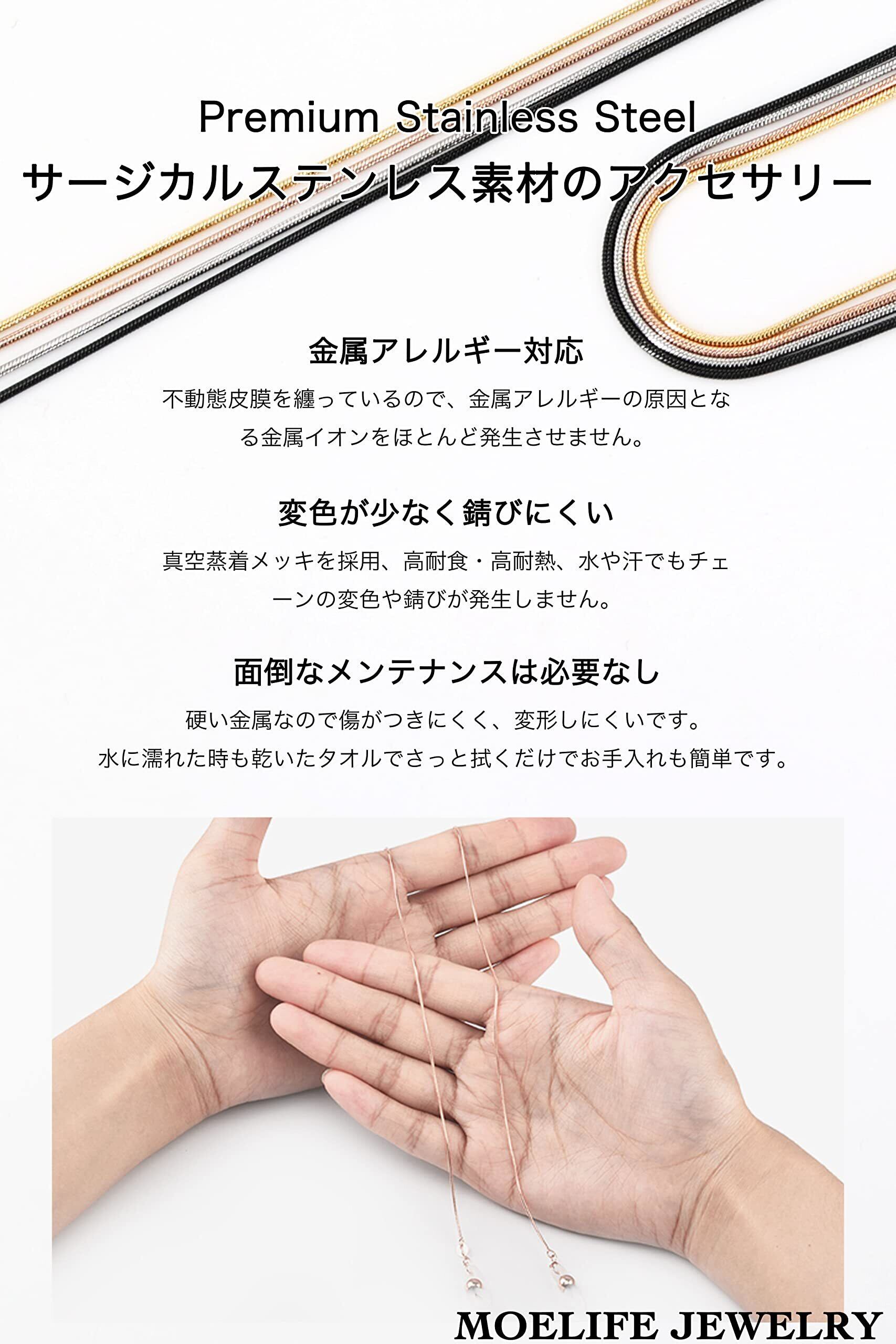 【サージカルステンレス素材】真空蒸着メッキを採用、高耐食・高耐熱、水や汗でもチェーンの変色や錆びが発生しません。金属アレルギーの原因となる金属イオンをほとんど発生させません。水に濡れた時も乾いたタオルでさっと拭くだけでお手入れも簡単です。