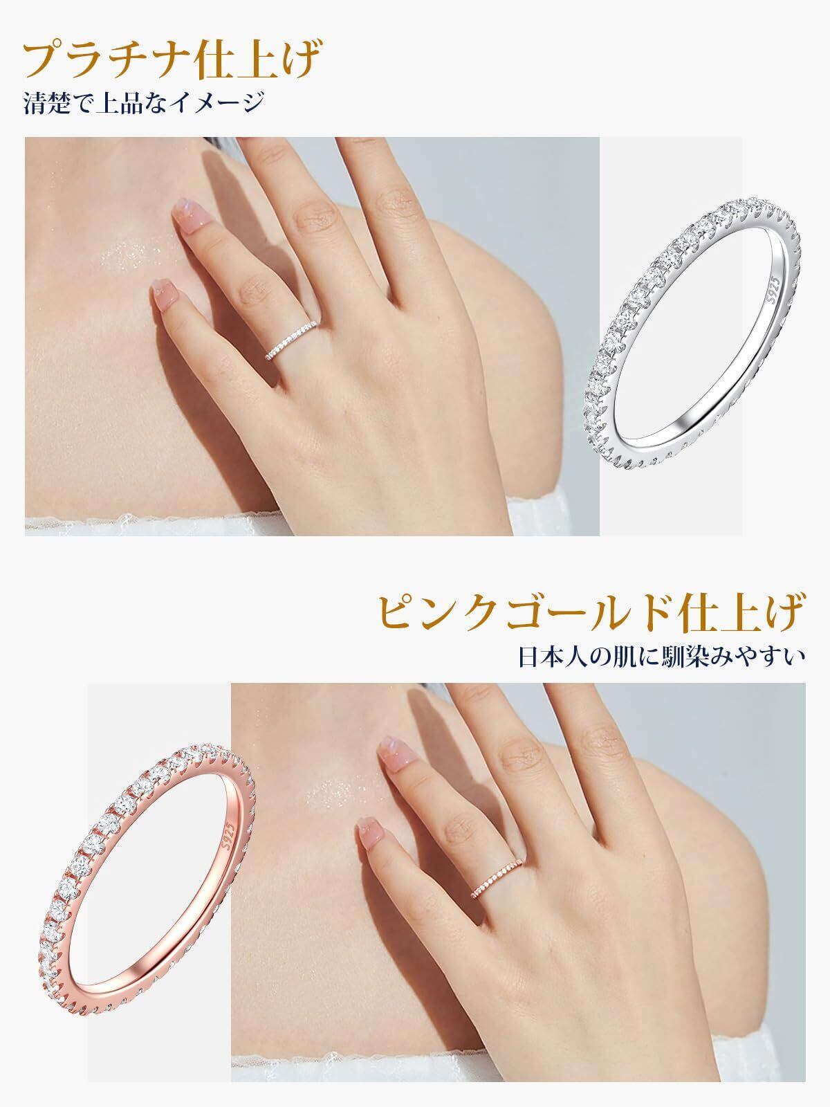 [カラーは2種類] エタニティリングの幅は約2mmです。カラーは清楚で上品なイメージのプラチナ仕上げと、日本人の肌に馴染みやすいピンクゴールド仕上げの2色展開です。