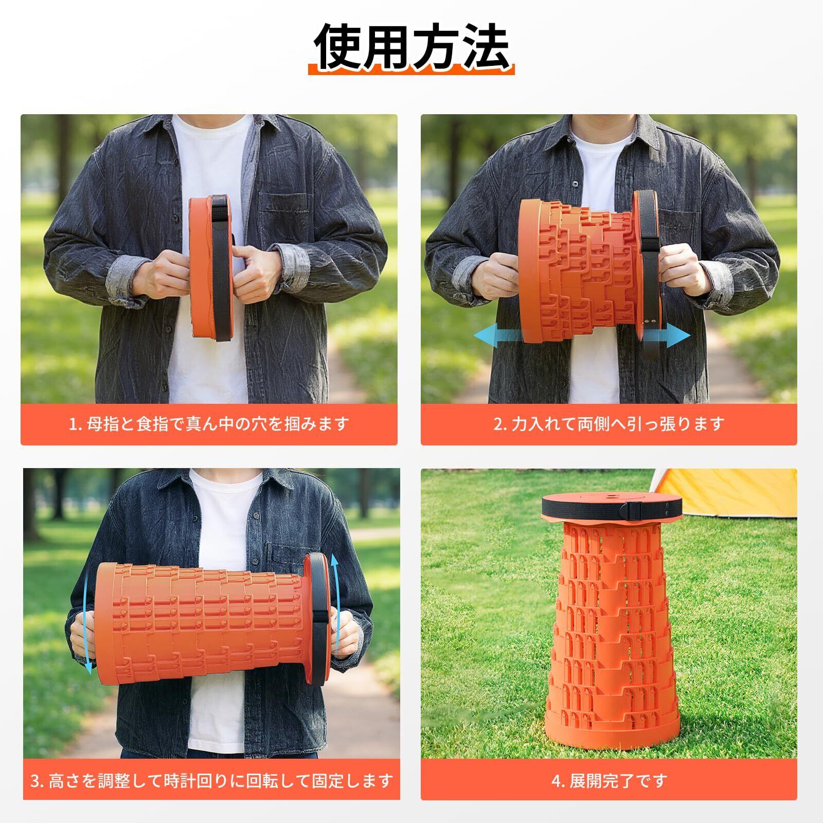 「一秒展開、簡単に使用」わずか1秒だけで簡単に展開します。指で折りたたみ椅子両側の穴を掴んで両側へ引っ張って、時計回りに回転して利用でき、必要ない手間を省く折りたたみ椅子です。日常の生活に楽に対応します。