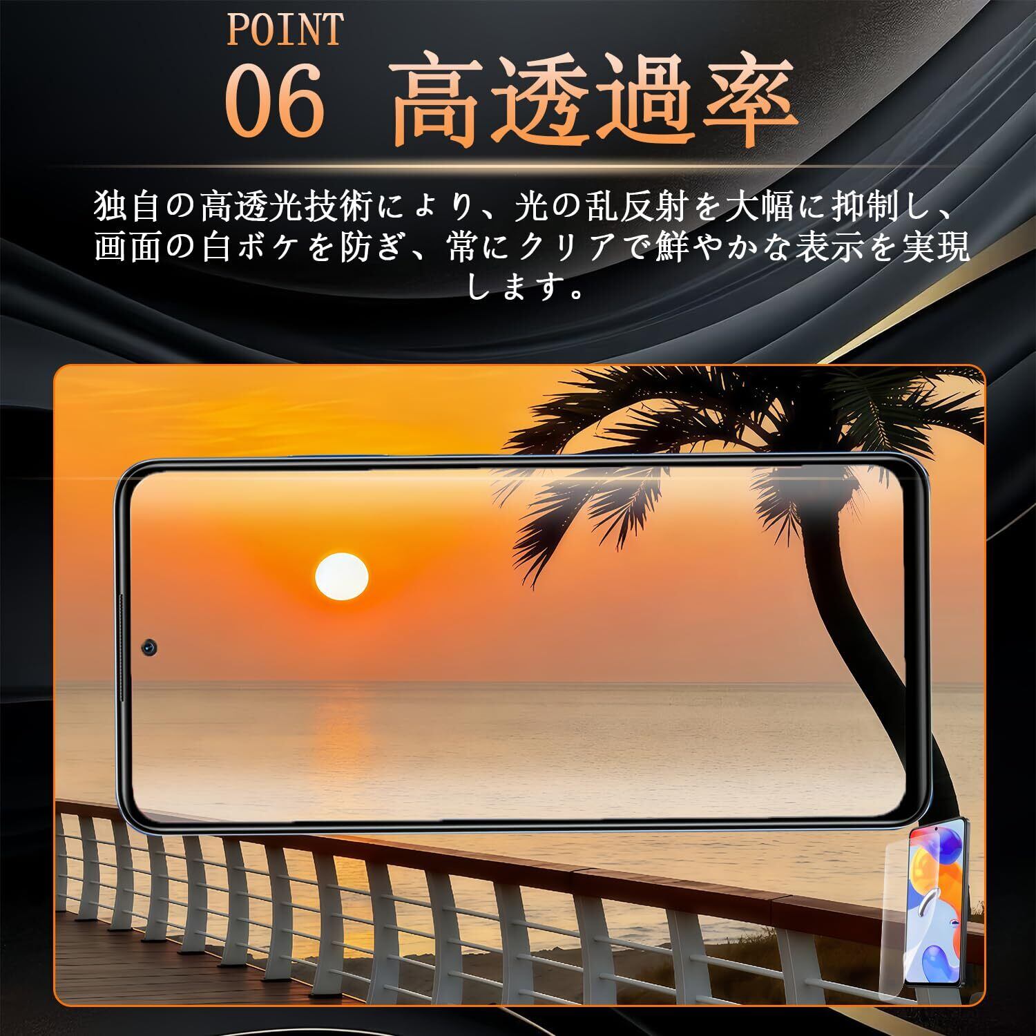 【傷修復性・気泡消滅機能】フィルムには高品質な熱可塑性ポリウレタン(TPU)を原料とする高分子素材を使用しています。この素材はゴムのような柔軟な弾力性と、硬質プラスチック並みの強力な耐久性を両立させ、日常で発生しやすい小さな傷や、貼付時に生じた少量の気泡に対して、24~48 時間以内に自動的に修復・消滅する特性を持っています。長期使用でも画面を美しく、スムーズな状態に保ちます。