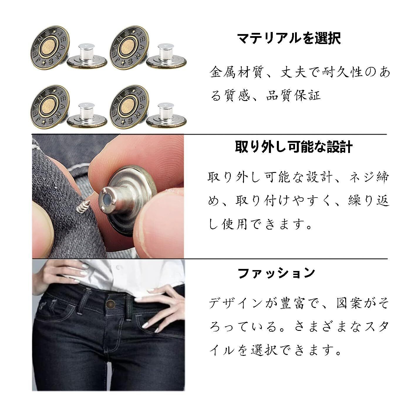 直径17 mm:クラシックサイズで、多種の衣類とアクセサリーに適している。デニムボタン10個+専用ドライバ1個:プレミアセット、日常交換の需要を満たし、専用工具を付属し、取り外しと取り付けがより便利である。