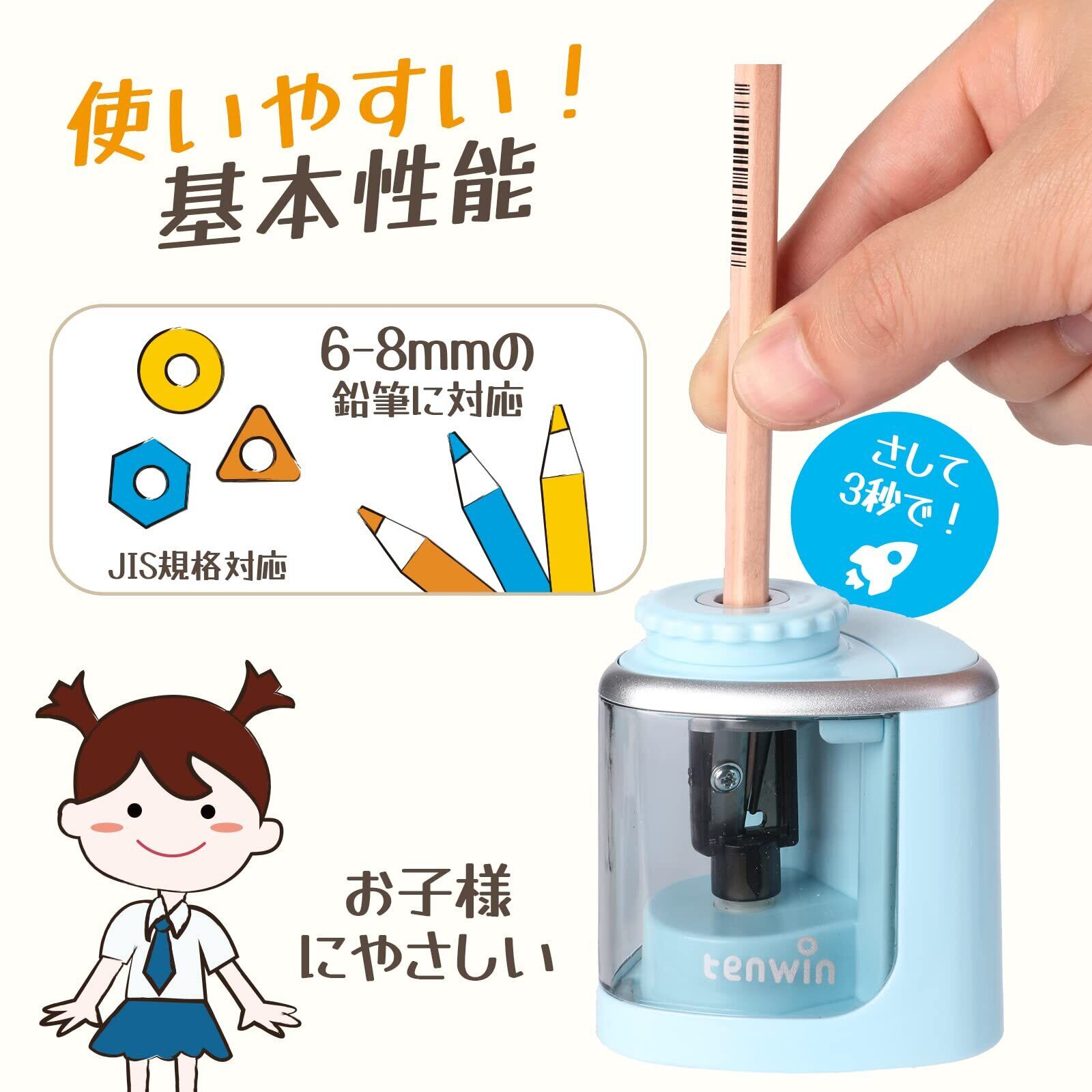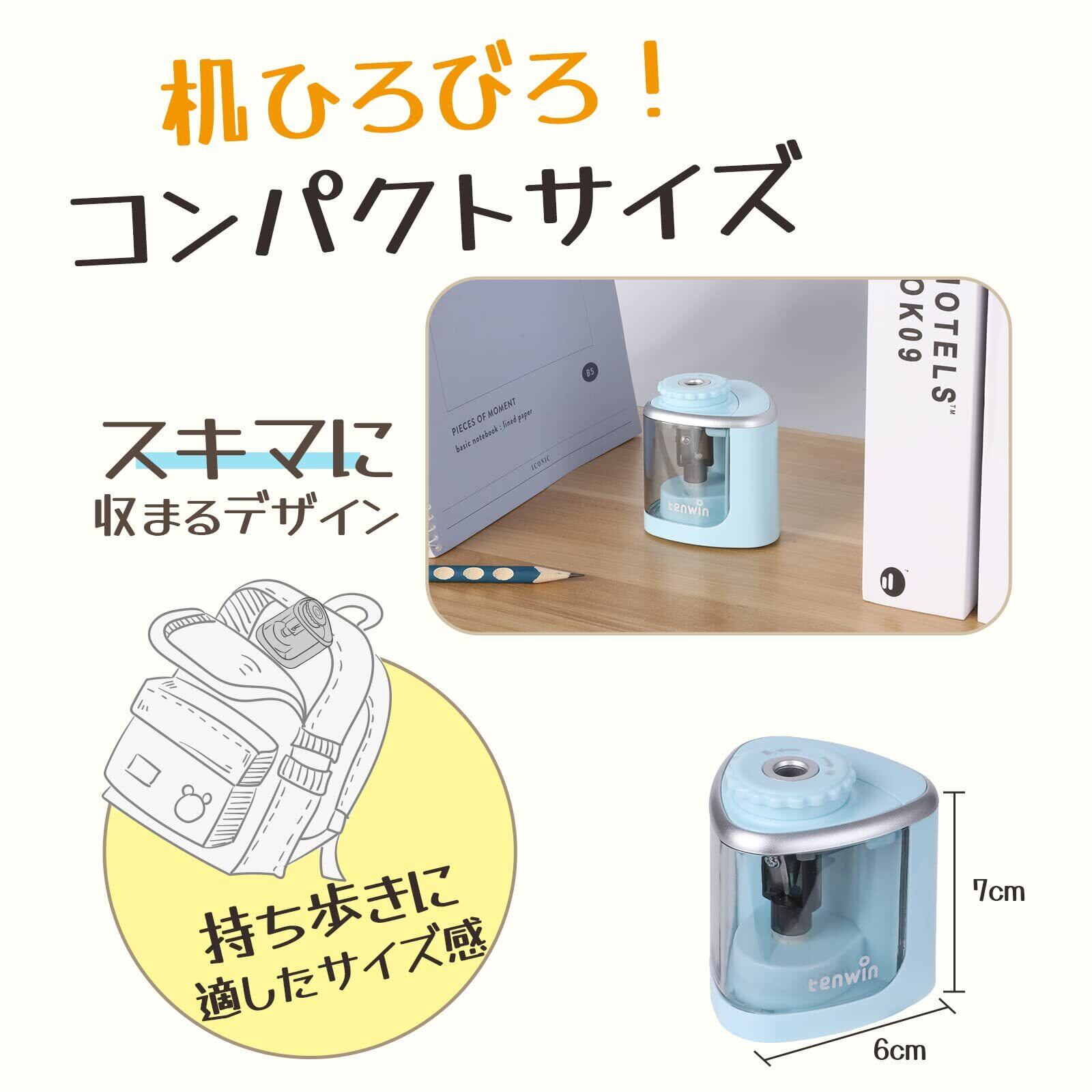 Tenwin 電動鉛筆削り コンパクト 人気シャープナー ミニタイプ 手動 両用 鉛筆削りコードレス 6-8mm鉛筆適用 乾電池 太軸 単三電池 2A電源供給 ムダ削り防止 小学生 子供 子ども 学習 学校 事務用 ブルー