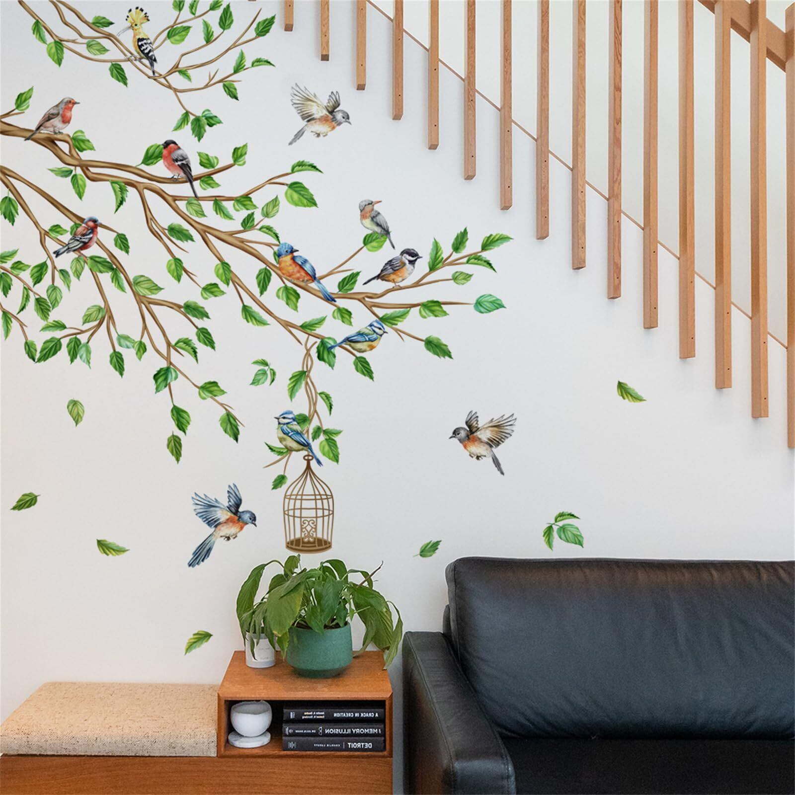 WALLMEII ウォールステッカー 木 枝 葉 自然風景 壁紙シール リビング 壁を飾る小鳥 鳥かご 緑葉 春 寝室 廊下 剥がせる ウォールペーパー インテリア DIY ウォールシール